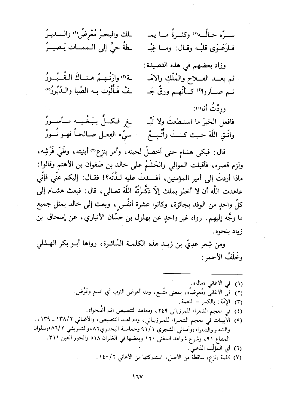 وَمِنْ شِعْرِ عَدِيِّ بْنِ زَيْدٍ هَذِهِ الْكَلِمَةُ السَّائِرَةُ، رَوَاهَا أبو بكر الهذلي وخلف الأحمر: