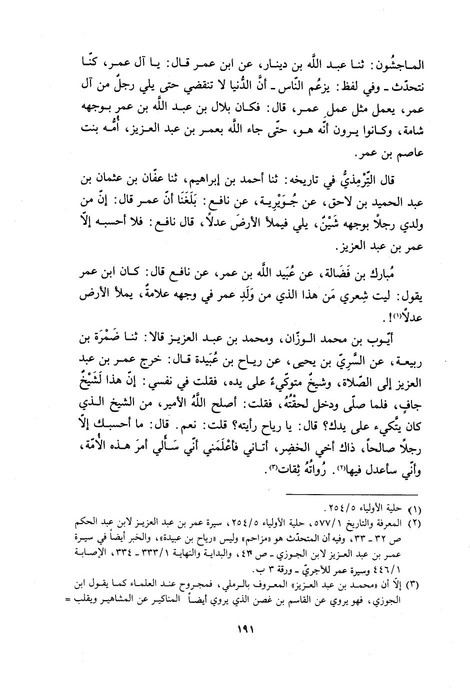 الْمَاجِشُونِ: ثَنَا عَبْدُ اللَّهِ بْنُ دِينَارٍ، عَنِ ابْنِ عُمَرَ قَالَ: يَا آلِ عُمَرَ، كُنَّا نَتَحَدَّثُ- وَفِي لَفْظٍ: يَزْعَمُ النَّاسُ- أَنَّ الدُّنْيَا لا تَنْقَضِي حَتَّى يَلِي رَجُلٌ مِنْ آلِ عُمَرَ، يَعْمَلُ مِثْلَ عَمَلِ عُمَرَ، قَالَ: فَكَانَ بِلالُ بْنُ عَبْدِ اللَّهِ بْنِ عُمَرَ بِوَجْهِهِ شَامَةٌ، وَكَانُوا يَرَوْنَ أَنَّهُ هُوَ، حَتَّى جَاءَ اللَّهُ بِعُمَرَ بْنِ عَبْدِ الْعَزِيزِ، أُمُّهُ بِنْتُ عَاصِمِ بْنِ عُمَرَ.