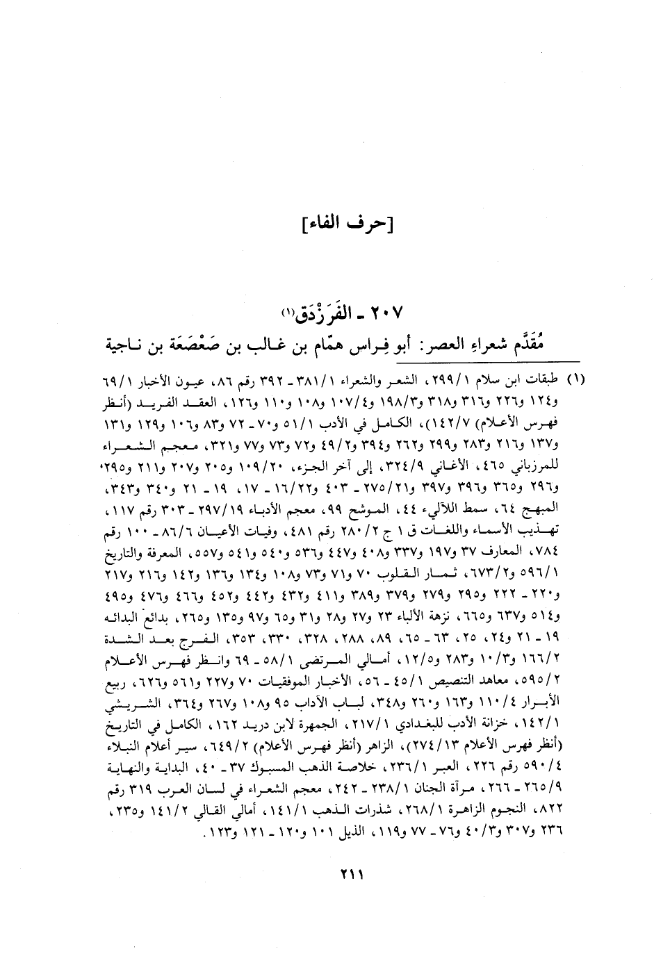 207- الْفَرَزْدَقُ [1] مُقدَّمُ شُعَرَاءِ الْعَصْرِ: أَبُو فِرَاسٍ هَمَّامُ بْنُ غَالِبِ بْنِ صَعْصَعَةَ بْنِ ناجية