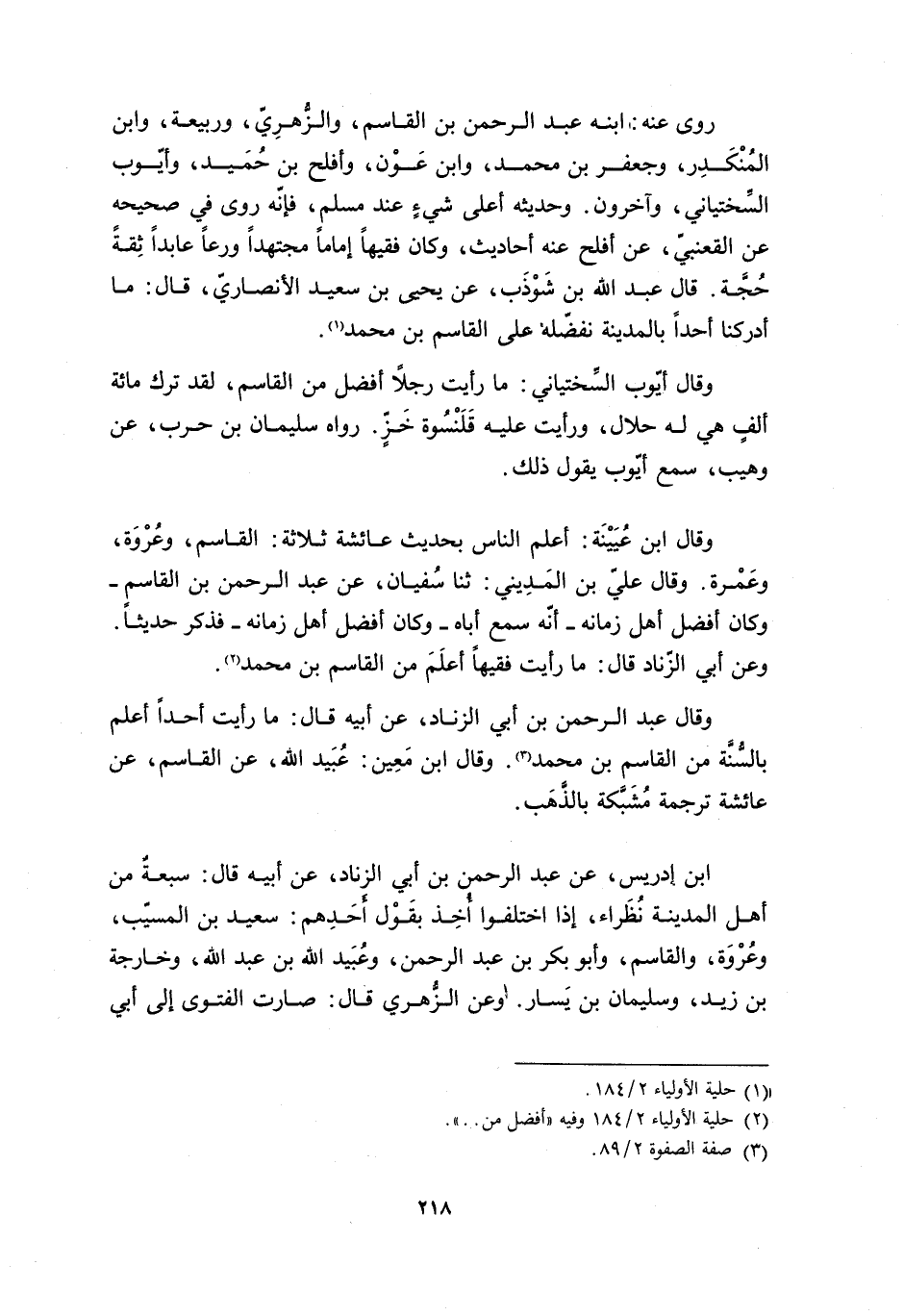 وَعَنْ أَبِي الزِّنَادِ قَالَ: مَا رَأَيْتُ فَقِيهًا أَعْلَمَ مِنَ الْقَاسِمِ بْنِ مُحَمَّدٍ [2] .