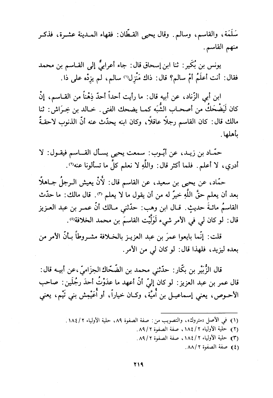 سَلَمَةَ، وَالْقَاسِمِ، وَسَالِمٍ. وَقَالَ يَحْيَى الْقَطَّانُ: فُقَهَاءُ الْمَدِينَةِ عَشَرَةٌ، فَذَكَرَ مِنْهُمُ الْقَاسِمَ.