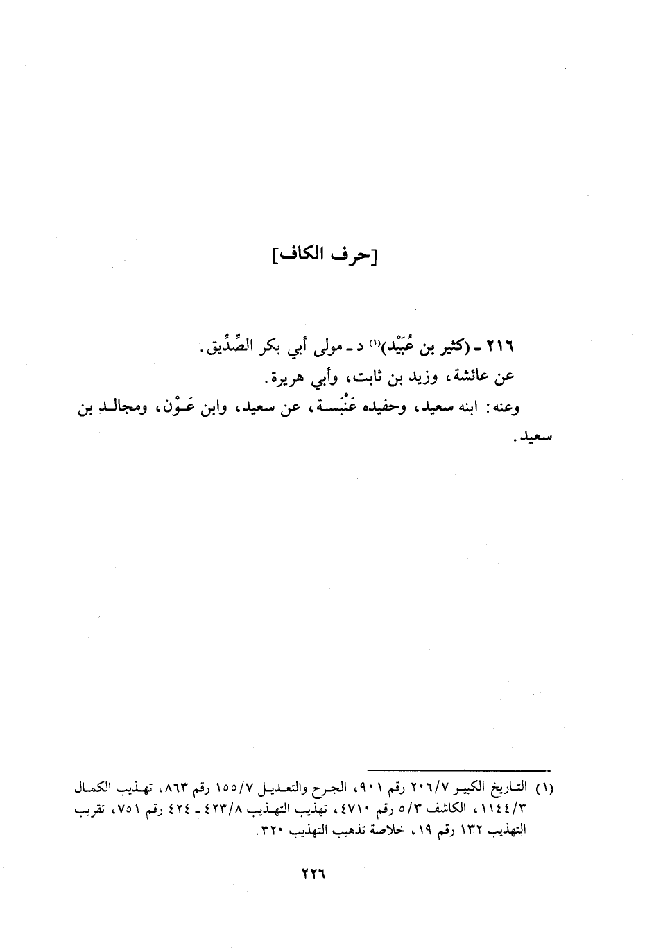 [1] التاريخ الكبير 7/ 206 رقم 901، الجرح والتعديل 7/ 155 رقم 863، تهذيب الكمال 3/ 1144، الكاشف 3/ 5 رقم 4710، تهذيب التهذيب 8/ 423- 424 رقم 751، تقريب التهذيب 132 رقم 19، خلاصة تذهيب التهذيب 320.