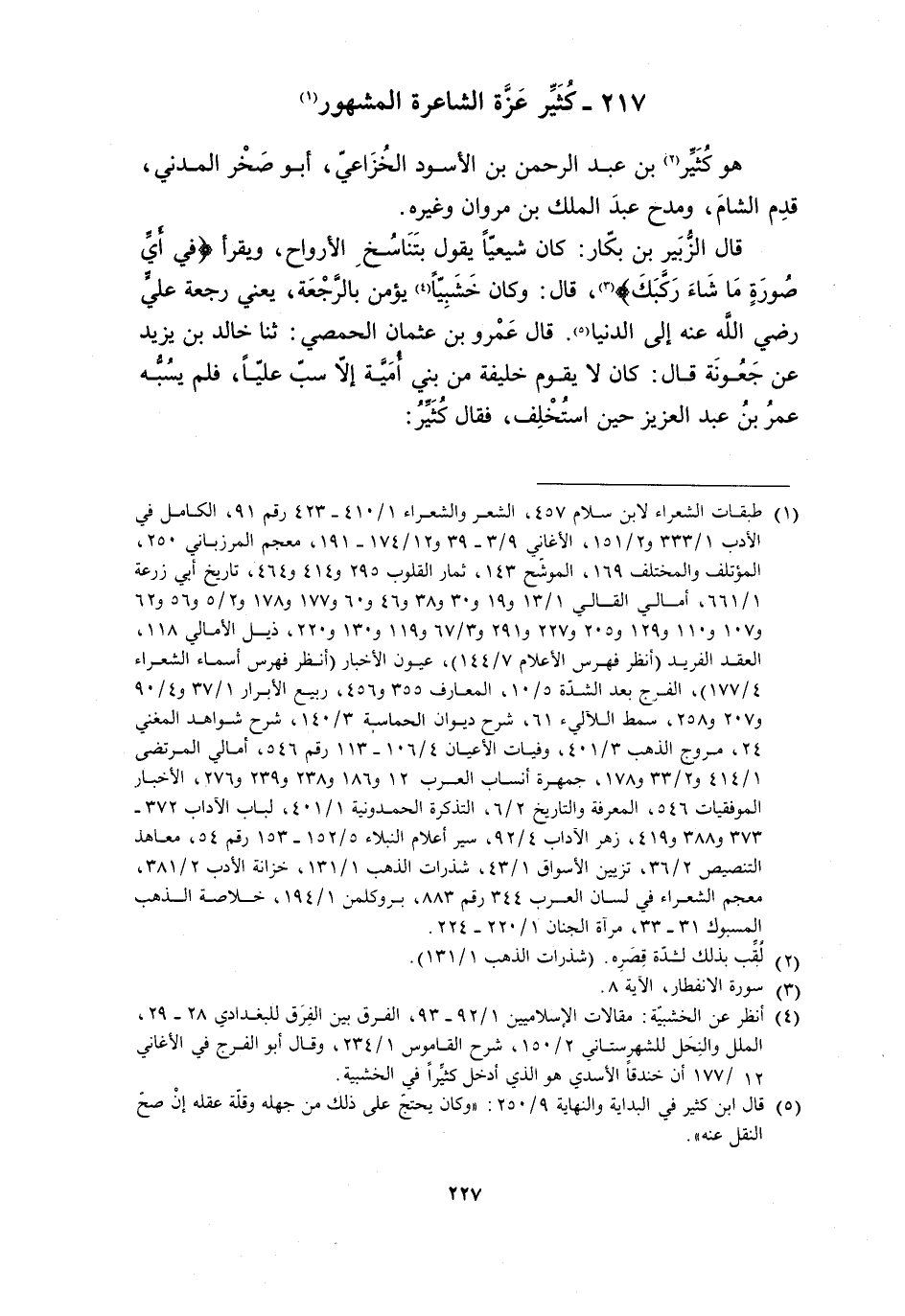 217- كثيّر عزّة الشاعرة المشهور [1] هو كثير [2] بن عبد الرحمن بن الأسود الخزاعي، أبو صخر المدني، قدم الشام، ومدح عبد الملك بن مروان وغيره.