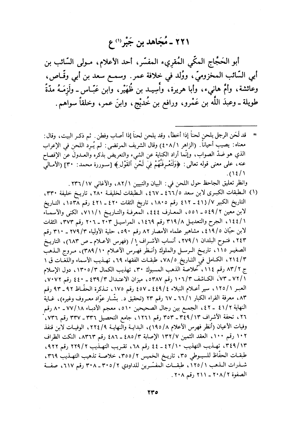 221- مجاهد بن جبر [1] ع أبو الحجّاج المكّي الْمُقرِئُ الْمُفَسِّرُ، أَحَدُ الأَعْلامِ، مَوْلَى السَّائِبِ بْنِ أَبِي السَّائِبِ الْمَخْزُومِيِّ، وَوُلِدَ فِي خِلافَةِ عُمَرَ. وَسَمِعَ سَعْدَ بْنَ أَبِي وَقَّاصٍ، وَعَائِشَةَ، وَأُمَّ هَانِئٍ، وَأَبَا هُرَيْرَةَ، وَأُسَيْدَ بْنَ ظُهَيْرٍ، وَابْنَ عَبَّاسٍ- وَلَزِمَهُ مُدَّةً طَوِيلَةً- وَعَبْدَ اللَّهِ بْنَ عَمْرٍو، وَرَافِعَ بْنَ خُديْجٍ، وَابْنَ عُمَرَ، وَخَلْقًا سواهم.