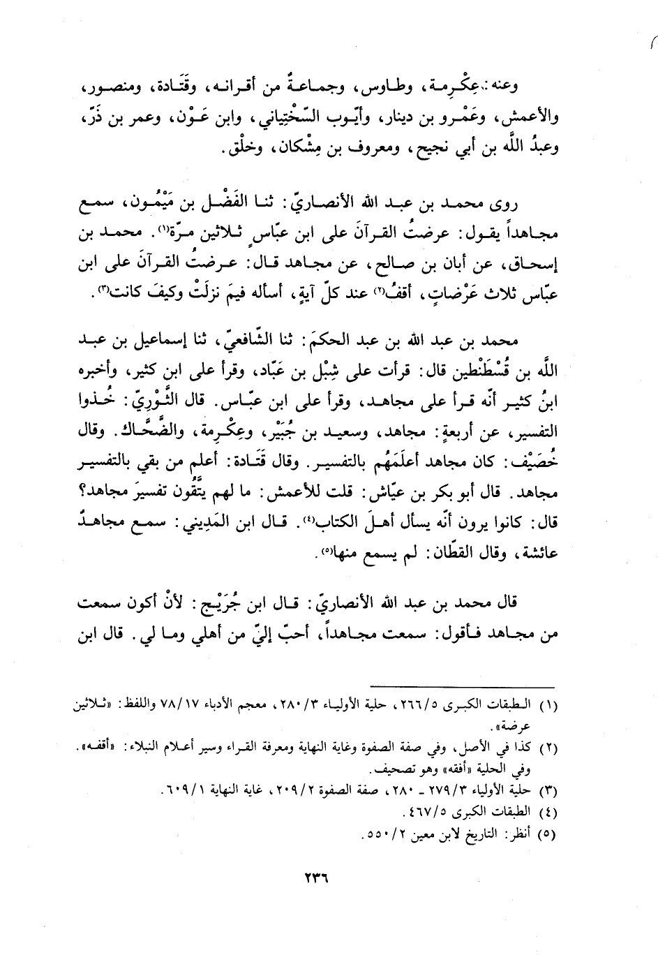 رَوَى مُحَمَّدُ بْنُ عَبْدِ اللَّهِ الأَنْصَارِيُّ: ثَنَا الْفَضْلُ بْنُ مَيْمُونٍ، سَمِعَ مُجَاهِدًا يَقُولُ: عَرَضْتُ الْقُرْآنَ عَلَى ابْنِ عَبَّاسٍ ثَلاثِينَ مَرَّةً [1] . مُحَمَّدُ بْنُ إِسْحَاقَ، عَنْ أَبَانِ بْنِ صَالِحٍ، عَنْ مُجَاهِدٍ قَالَ: عَرَضْتُ الْقُرْآنَ عَلَى ابْنِ عَبَّاسٍ ثَلاثَ عَرْضَاتٍ، أَقِفُ [2] عِنْدَ كُلِّ آيَةٍ، أَسْأَلُهُ فِيمَ نَزَلَتْ وَكَيْفَ كَانَتْ [3] .