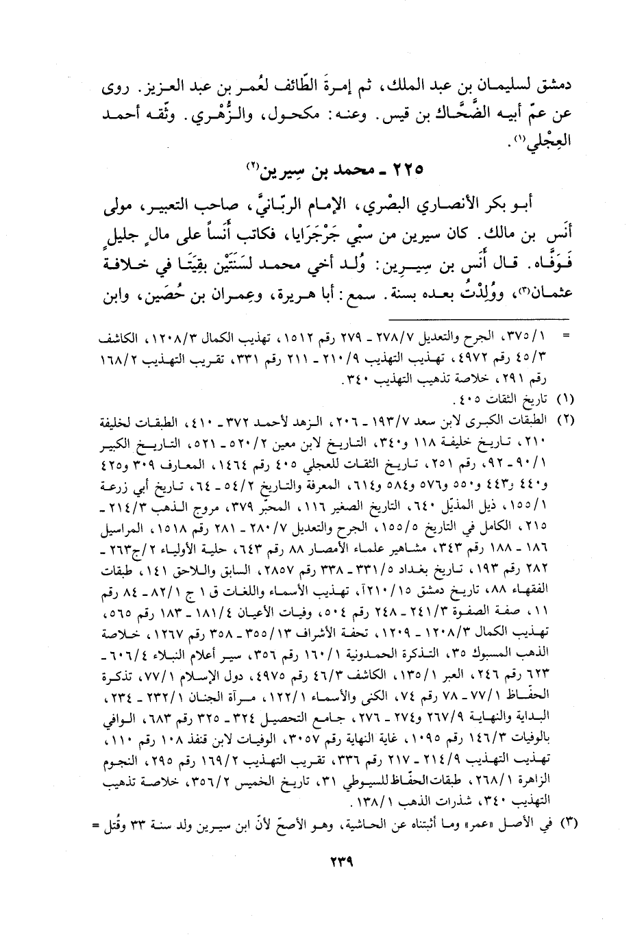 225- مُحَمَّدُ بْنُ سِيرِينَ [2] أَبُو بَكْرٍ الأَنْصَارِيُّ الْبَصْرِيُّ، الإِمَامُ الرَّبَّانِيُّ، صَاحِبُ التَّعْبِيرِ، مَوْلَى أَنَسِ بْنِ مَالِكٍ. كَانَ سِيرِينُ مِنْ سَبْيِ جَرْجَرَايَا، فَكَاتَبَ أَنَسًا عَلَى مَالٍ جَلِيلٍ فَوَفَّاهُ. قَالَ أَنَسُ بْنُ سِيرِينَ: وُلِدَ أخي محمد لسنتين بقيتا في خِلافَةِ عُثْمَانَ [3] ، وَوُلِدْتُ بَعْدَهُ بِسَنَةٍ. سَمِعَ: أَبَا هريرة، وعمران بن حصين، وابن