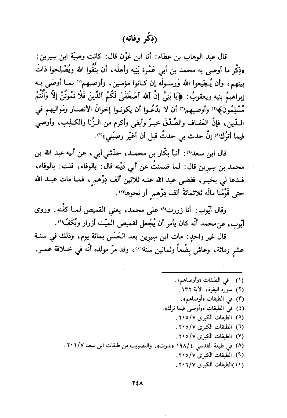 (ذِكْرُ وَفَاتِهِ) قَالَ عَبْدُ الْوَهَّابِ بْنُ عَطَاءٍ: أَنَا ابْنُ عَوْنٍ قَالَ: كَانَتْ وَصِيَّةُ ابْنِ سِيرِينَ: