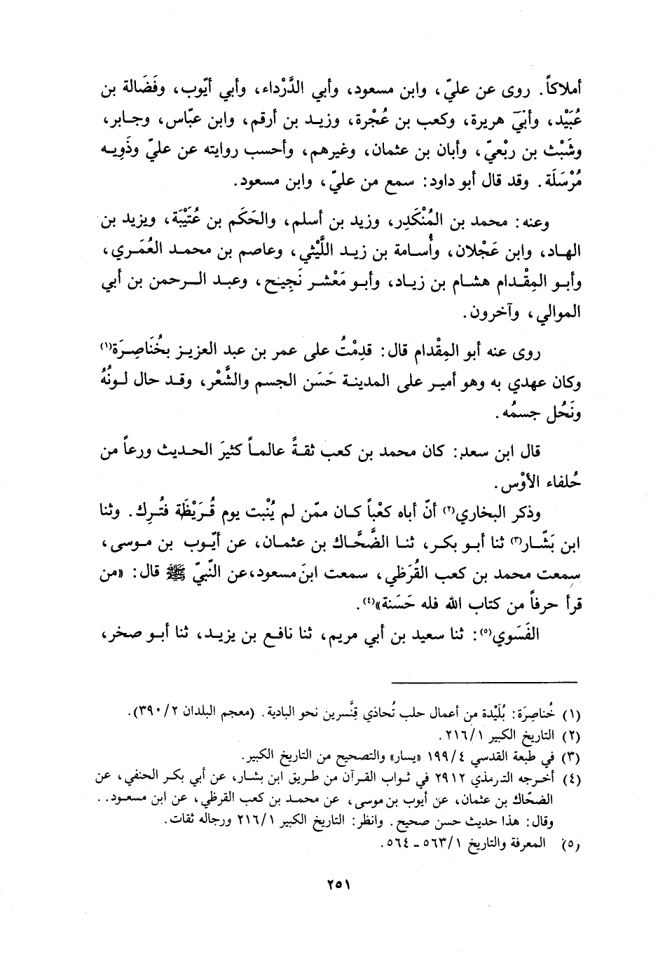 وَذَكَرَ الْبُخَارِيُّ [2] أَنَّ أَبَاهُ كَعْبًا كَانَ مِمَّنْ لَمْ يُنْبِتْ يَوْمَ قُرَيْظَةَ فَتُرِكَ. وَثَنَا ابْنُ بَشَّارٍ [3] ثَنَا أَبُو بَكْرٍ، ثَنَا الضَّحَّاكُ بْنُ عُثْمَانَ، عَنْ أَيُّوبَ بْنِ مُوسَى، سَمِعْتُ مُحَمَّدَ بْنَ كَعْبٍ الْقُرَظِيَّ، سَمِعْتُ ابْنَ مَسْعُودٍ، عَنِ النَّبِيِّ صَلَّى اللَّهُ عَلَيْهِ وَسَلَّمَ قَالَ: «مَنْ قَرَأَ حَرْفًا مِنْ كِتَابِ اللَّهِ فَلَهُ حَسَنَةٌ» [4] . الْفَسَوِيُّ [5] : ثَنَا سَعِيدُ بْنُ أَبِي مَرْيَمَ، ثَنَا نَافِعُ بْنُ يَزِيدَ، ثَنَا أبو صخر،
