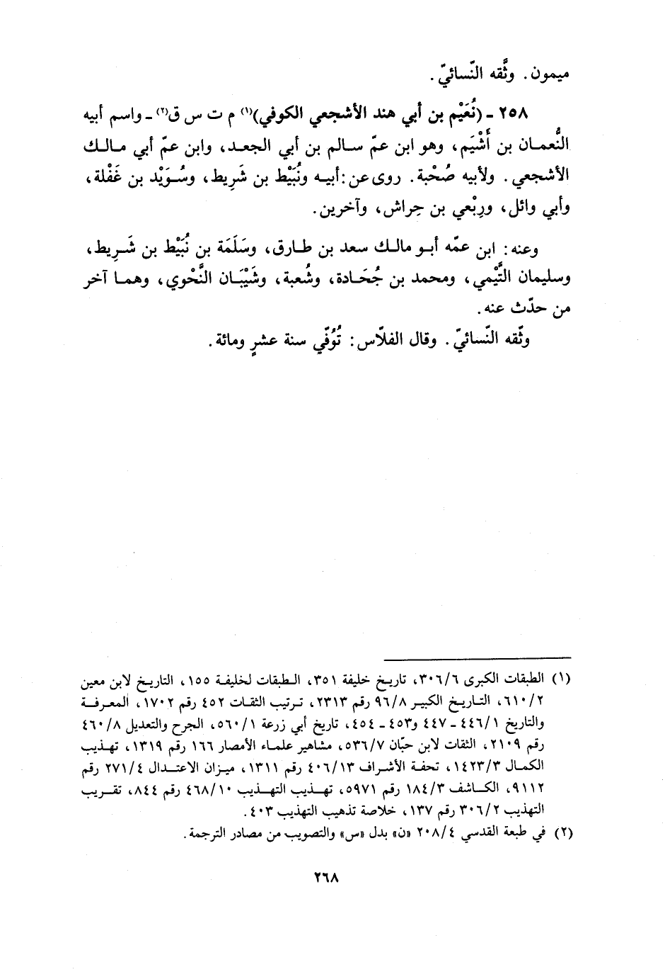 258- (نُعَيْمُ بْنُ أَبِي هِنْدٍ الأَشْجَعِيُّ الْكُوفِيّ) [1] م ت س ق [2]- وَاسْمُ أَبِيهِ النُّعمان بْنُ أَشْيَمَ، وَهُوَ ابْنُ عَمِّ سَالِمِ بْنِ أَبِي الْجَعْدِ، وَابْنُ عَمِّ أَبِي مالك الأشجعي. وَلِأَبِيهِ صُحْبَةٌ. رَوَى عَنْ: أَبِيهِ وَنُبَيْطِ بْنِ شَرِيطٍ، وَسُوَيْدِ بْنِ غَفْلَةَ، وَأَبِي وَائِلٍ، وَرِبْعِيِّ بْنِ حِرَاشٍ، وَآخَرِينَ.