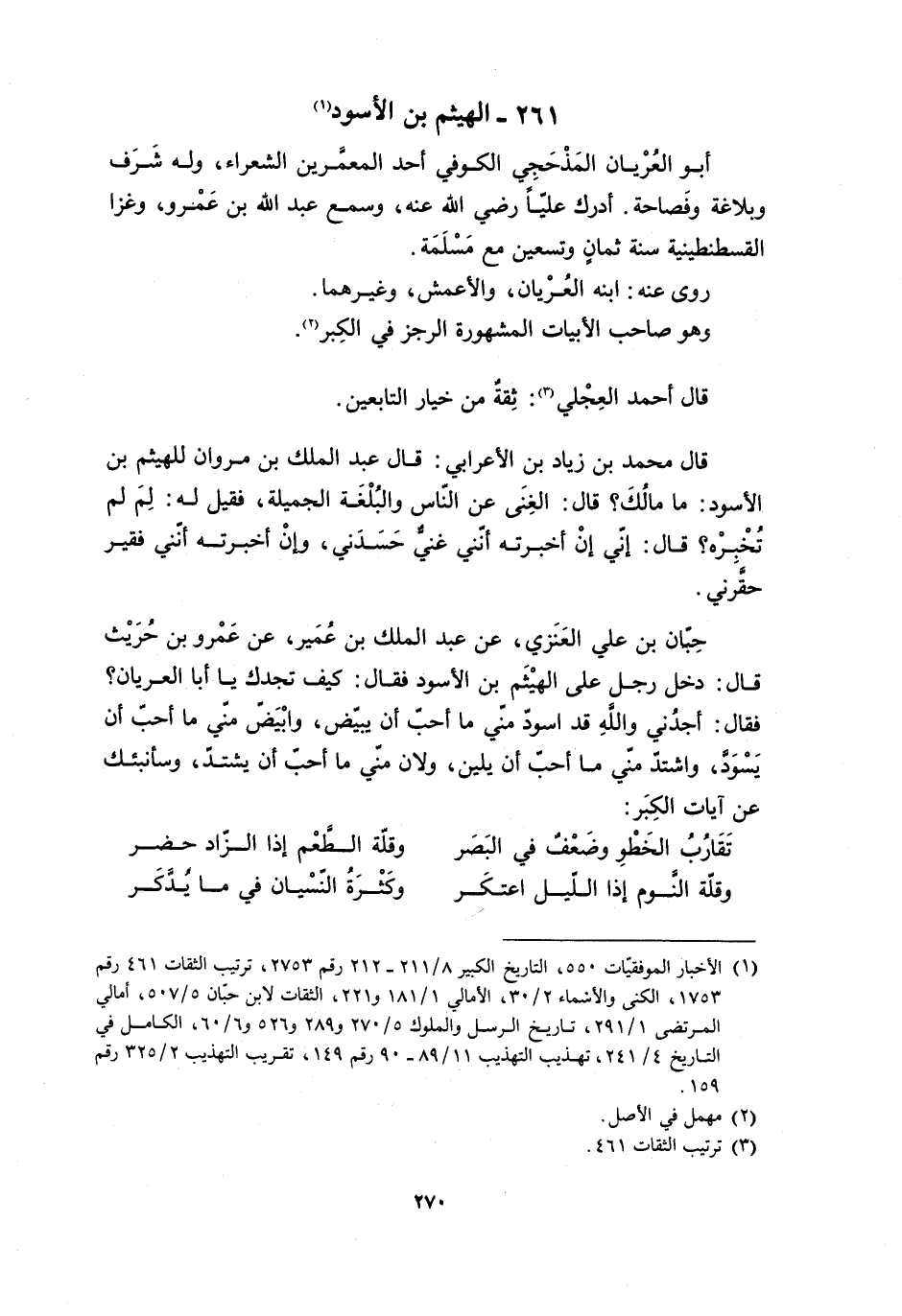 261- الْهَيْثَمُ بْنُ الأَسْوَدِ [1] أَبُو الْعُرْيَانِ الْمَذْحِجِيُّ الْكُوفِيُّ أَحَدُ الْمُعَمَّرِينَ الشُّعَرَاءِ، وَلَهُ شَرَفٌ وَبَلاغَةٌ وَفَصَاحَةٌ. أَدْرَكَ عَلِيًّا رَضِيَ اللَّهُ عَنْهُ، وسمع عَبْد الله بْن عَمْرو، وغزا القسطنطينية سنة ثمان وتسعين مع مسلمة.