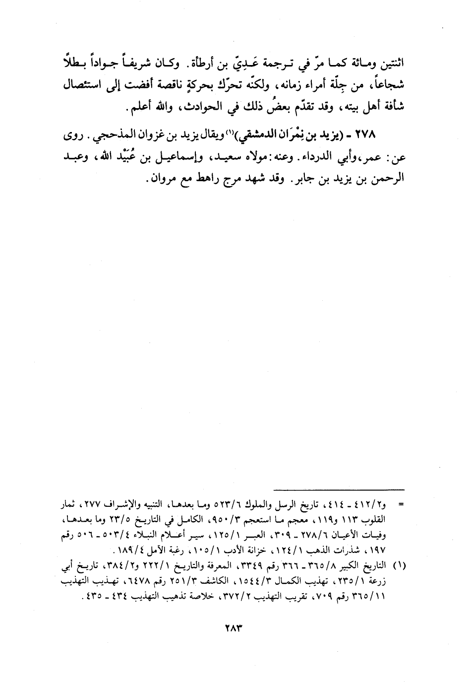 278- (يَزِيدُ بْنُ نِمْرَانَ الدِّمَشْقِيُّ) [1] وَيُقَالُ يَزِيدُ بْنُ غَزْوَانَ الْمَذْحِجِيُّ. رَوَى عَنْ: عُمَرَ، وَأَبِي الدَّرْدَاءِ. وَعَنْهُ: مَوْلاهُ سَعِيدٌ، وَإِسْمَاعِيلُ بْنُ عُبَيْدِ اللَّهِ، وَعَبْدُ الرَّحْمَنِ بْنُ يَزِيدَ بْنِ جَابِرٍ. وقد شهد مرج راهط مع مروان.