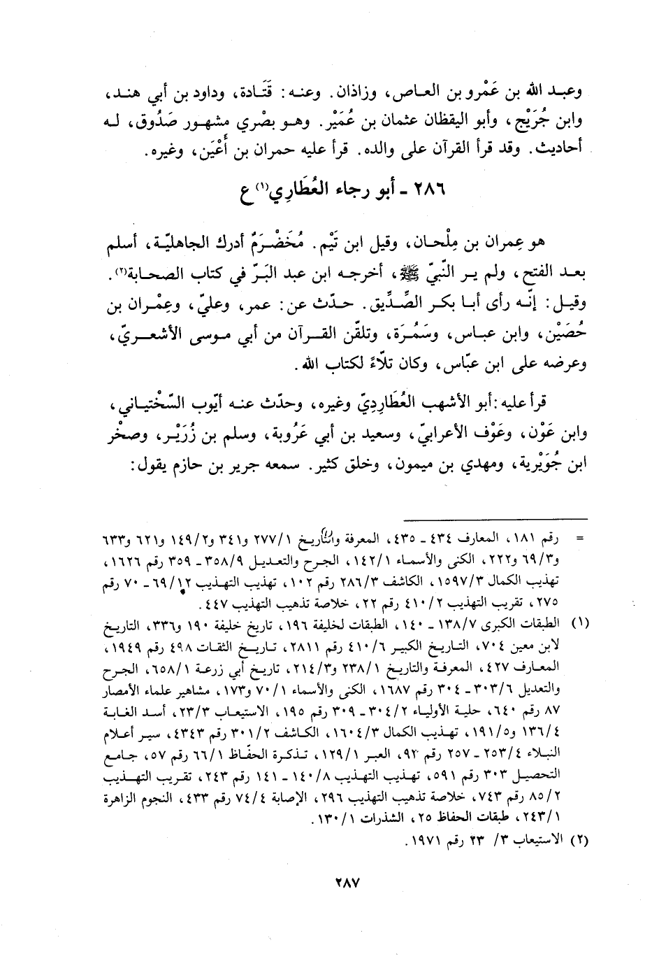 286- أبو رجاء العطاري [1] ع هُوَ عِمْرَانُ بْنُ مِلْحَانَ، وَقِيلَ ابْنُ تَيْمٍ. مُخَضْرَمٌ أَدْرَكَ الْجَاهِلِيَّةَ، أَسْلَمَ بَعْدَ الْفَتْحِ، وَلَمْ يَرَ النَّبِيَّ صَلَّى اللَّهُ عَلَيْهِ وَسَلَّمَ، أَخْرَجَهُ ابْنُ عَبْدِ الْبَرِّ فِي كِتَابِ الصَّحَابَةِ [2] .