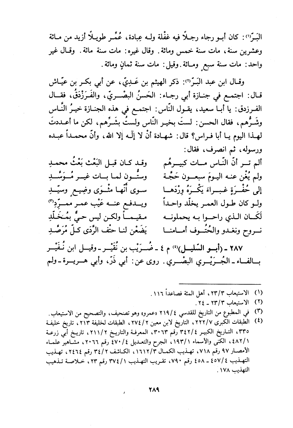 287- (أَبُو السَّلِيلِ) [4] م 4- ضريب بن نقير- وقيل ابن نفير بِالْفَاءِ- الْجُرَيْرِيُّ الْبَصْرِيُّ. رَوَى عَنْ: أَبِي ذَرٍّ، وأبى هريرة- ولم
