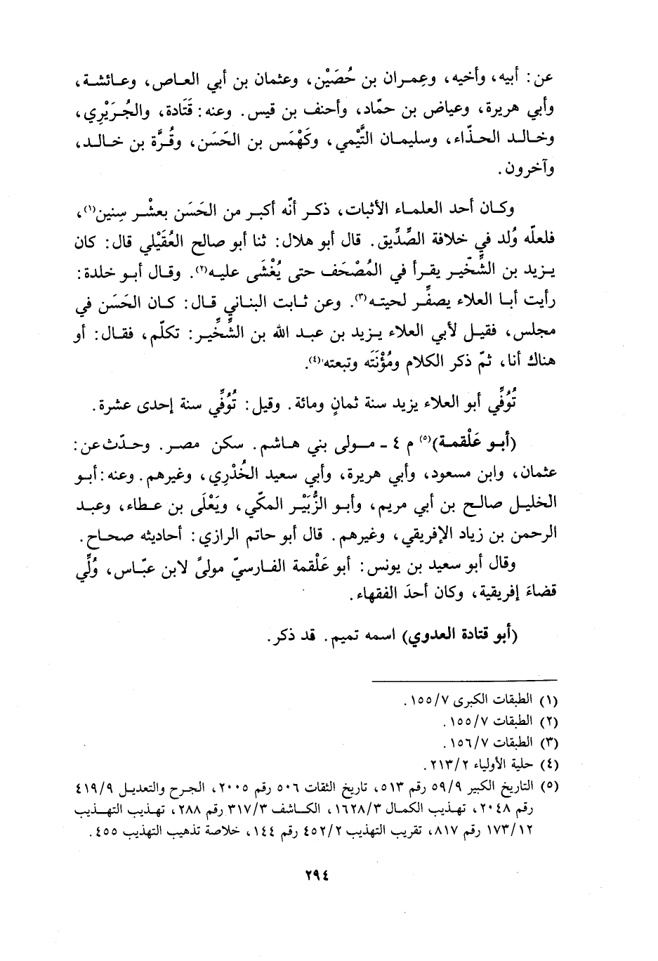 رَأَيْتُ أَبَا الْعَلاءِ يُصَفِّرُ لِحْيَتَهُ [3] . وَعَنْ ثَابِتٍ الْبُنَانِيِّ قَالَ: كَانَ الْحَسَنُ فِي مَجْلِسٍ، فَقِيلَ لِأَبِي الْعَلاءِ يَزِيدَ بْنِ عَبْدِ اللَّهِ بْنِ الشِّخِّيرِ: تَكَلَّمْ، فَقَالَ: أَوْ هُنَاكَ أَنَا، ثُمَّ ذَكَرَ الْكَلامَ وَمُؤْنَتَهُ وَتَبِعَتَهُ [4] .