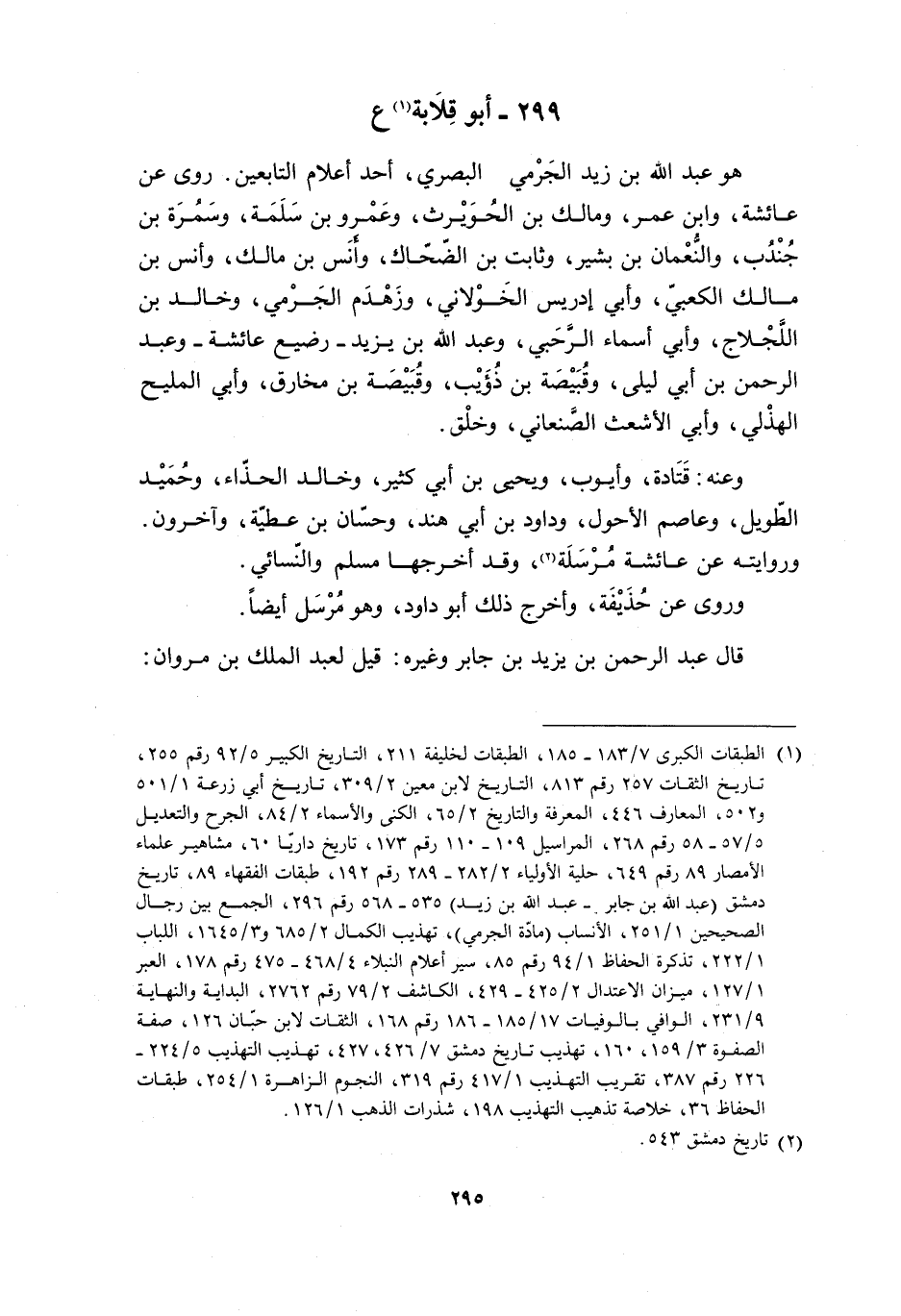 299- أبو قلابة [1] ع هُوَ عَبْدُ اللَّهِ بْنُ زَيْدٍ الْجَرْمِيُّ الْبَصْرِيُّ، أَحَدُ أَعْلامِ التَّابِعِينَ. رَوَى عَنْ عَائِشَةَ، وَابْنِ عُمَرَ، وَمَالِكِ بْنِ الْحُوَيْرِثِ، وَعَمْرِو بْنِ سَلَمَةَ، وَسَمُرَةَ بْنِ جُنْدُبٍ، وَالنُّعْمَانِ بْنِ بَشِيرٍ، وَثَابِتِ بْنِ الضَّحَّاكِ، وَأَنَسِ بْنِ مَالِكٍ، وَأَنَسِ بْنِ مَالِكٍ الْكَعْبِيِّ، وَأَبِي إِدْرِيسَ الْخَوْلانِيِّ، وَزَهْدَمٍ الْجَرْمِيِّ، وَخَالِدِ بْنِ اللَّجْلاجِ، وَأَبِي أَسْمَاءَ الرَّحَبِيِّ، وَعَبْدِ اللَّهِ بْنِ يَزِيدَ- رَضِيعُ عَائِشَةَ- وَعَبْدِ الرَّحْمَنِ بْنِ أَبِي لَيْلَى، وَقُبَيْصَةَ بْنِ ذُؤَيْبٍ، وَقُبَيْصَةَ بْنِ مُخَارِقٍ، وَأَبِي الْمُلَيْحِ الْهُذَلِيِّ، وَأَبِي الأَشْعَثِ الصَّنْعَانِيِّ، وَخَلْقٍ.
