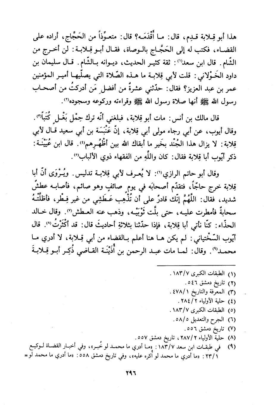 هذا أبو قلابة قدم، قَالَ: مَا أَقْدَمَهُ؟ قَالَ: مُتَعَوِّذًا مِنَ الْحَجَّاجِ، أَرَادَهُ عَلَى الْقَضَاءِ، فَكَتَبَ لَهُ إِلَى الْحَجَّاجِ بِالْوِصَاةِ، فَقَالَ أَبُو قِلابَةَ: لَنْ أَخْرُجَ مِنَ الشَّامِ. قَالَ ابْنُ سَعْدٍ [1] : ثِقَةٌ كَثِيرُ الْحَدِيثِ، دِيوَانُهُ بِالشَّامِ. قَالَ سُلَيْمَانُ بْنُ دَاوُدَ الْخَوْلانِيُّ: قُلْتُ لِأَبِي قِلابَةَ مَا هَذِهِ الصَّلاةِ الَّتِي يُصَلِّيهَا أَمِيرُ الْمُؤْمِنِينَ عُمَرُ بْنُ عَبْدِ الْعَزِيزِ؟ فَقَالَ: حَدَّثَنِي عَشَرَةٌ مِنْ أَفْضَلِ مَنْ أَدْرَكْتُ مِنْ أَصْحَابِ رَسُولِ اللَّهِ صَلَّى اللَّهُ عَلَيْهِ وَسَلَّمَ أَنَّهَا صَلاةُ رَسُول اللَّهِ صَلَّى اللَّهُ عَلَيْهِ وَسَلَّمَ وَقِرَاءَتُهُ وَرُكُوعُهُ وَسُجُودُهُ [2] .