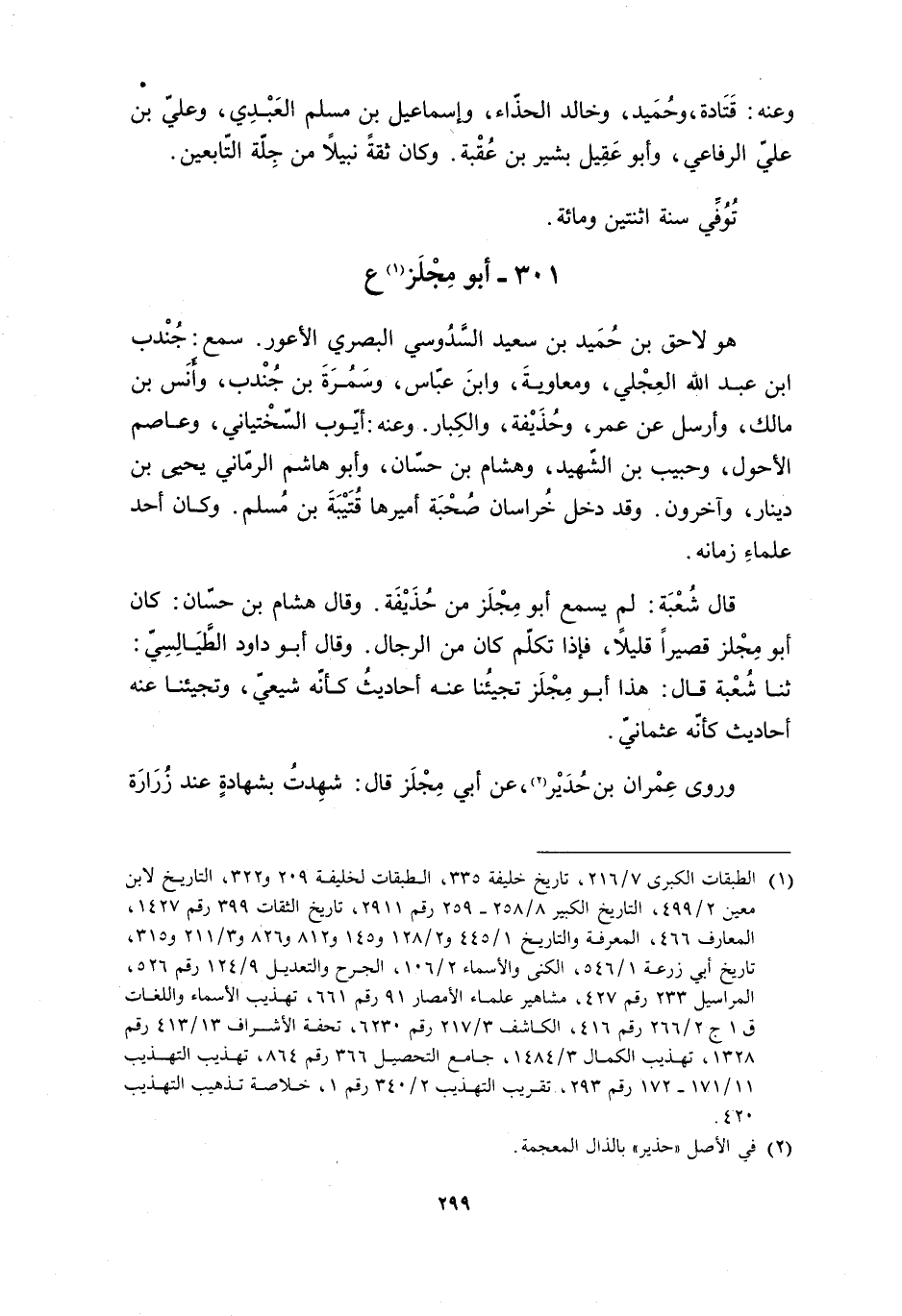 301- أبو مجلز [1] ع هُوَ لاحِقُ بْنُ حُمَيْدِ بْنِ سَعِيدٍ السَّدُوسِيُّ البصري الأعور. سمع: جندب ابن عَبْدِ اللَّهِ الْعِجْلِيَّ، وَمُعَاوِيَةَ، وَابْنَ عَبَّاسٍ، وَسَمُرَةَ بْنَ جُنْدَبٍ، وَأَنَسَ بْنَ مَالِكٍ، وَأَرْسَلَ عَنْ عُمَرَ، وَحُذَيْفَةَ، وَالْكِبَارِ. وَعَنْهُ: أَيُّوبُ السِّخْتِيَانِيُّ، وَعَاصِمٌ الأَحْوَلُ، وَحَبِيبُ بْنُ الشَّهِيدِ، وَهِشَامُ بْنُ حَسَّانَ، وَأَبُو هَاشِمٍ الرَّمَانِيُّ يَحْيَى بْنُ دِينَارٍ، وَآخَرُونَ. وَقَدْ دَخَلَ خُرَاسَانَ صُحْبَةَ أَمِيرِهَا قُتَيْبَةَ بْنِ مُسْلِمٍ. وَكَانَ أَحَدَ عُلَمَاءِ زَمَانِهِ.