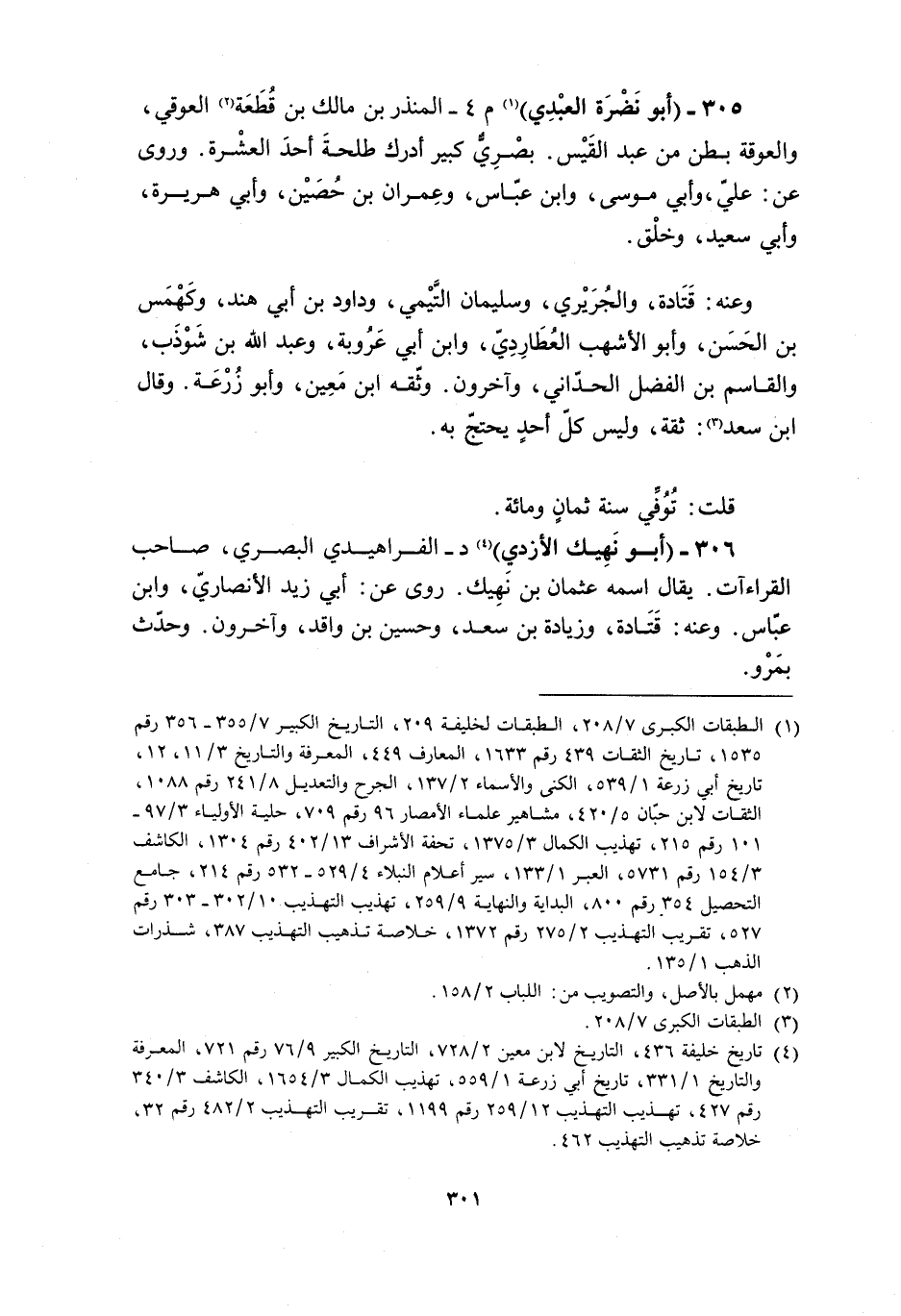 306- (أبو نهيك الأزدي) [4] د- الفراهيدي البصري، صَاحِبُ الْقِرَاءَاتِ. يُقَالُ اسْمُهُ عُثْمَانُ بْنُ نَهِيكٍ. رَوَى عَنْ: أَبِي زَيْدٍ الأَنْصَارِيِّ، وَابْنِ عَبَّاسٍ. وعنه: قتادة، وزيادة بن سعد، وحسين بن واقد، وآخرون. وحدّث بمرو.