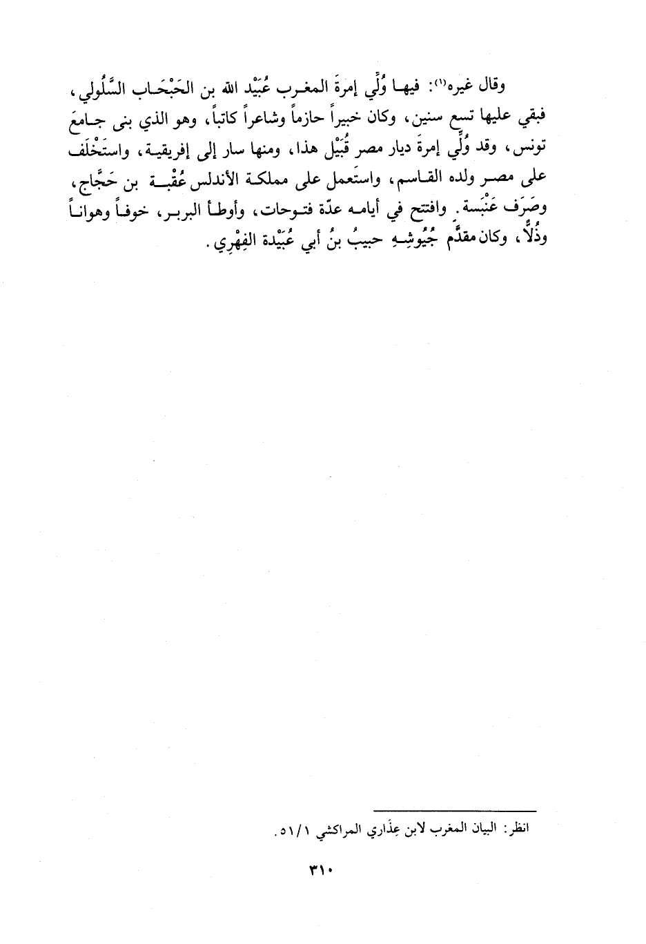 وَقَالَ غَيْرُهُ [1] : فِيهَا وُلِّيَ إِمْرَةَ الْمَغْرِبِ عُبَيْدُ اللَّهِ بْنُ الْحَبْحَابِ السَّلُولِيُّ، فَبَقِيَ عَلَيْهَا تِسْعَ سِنِينَ، وَكَانَ خَبِيرًا حَازِمًا وَشَاعِرًا كَاتِبًا، وَهُوَ الَّذِي بَنَى جَامِعَ تُونُسَ، وَقَدْ وُلِّيَ إِمْرَةَ دِيَارِ مِصْرَ قُبَيْلَ هَذَا، وَمِنْهَا سَارَ إِلَى إِفْرِيقِيَةَ، وَاسْتَخْلَفَ عَلَى مِصْرَ وَلَدَهُ الْقَاسِمَ، وَاسْتَعْمَلَ عَلَى مَمْلَكَةِ الأَنْدَلُسِ عُقْبَةَ بْنَ حَجَّاجٍ، وَصَرَفَ عَنْبَسَةَ. وَافْتَتَحَ فِي أَيَّامِهِ عِدَّةَ فُتُوحَاتٍ، وَأَوْطَأَ الْبَرْبَرُ، خَوْفًا وَهَوَانًا وَذُلا، وَكَانَ مُقَدَّمَ جُيُوشِهِ حبيب بن أبي عبيدة الفهري.