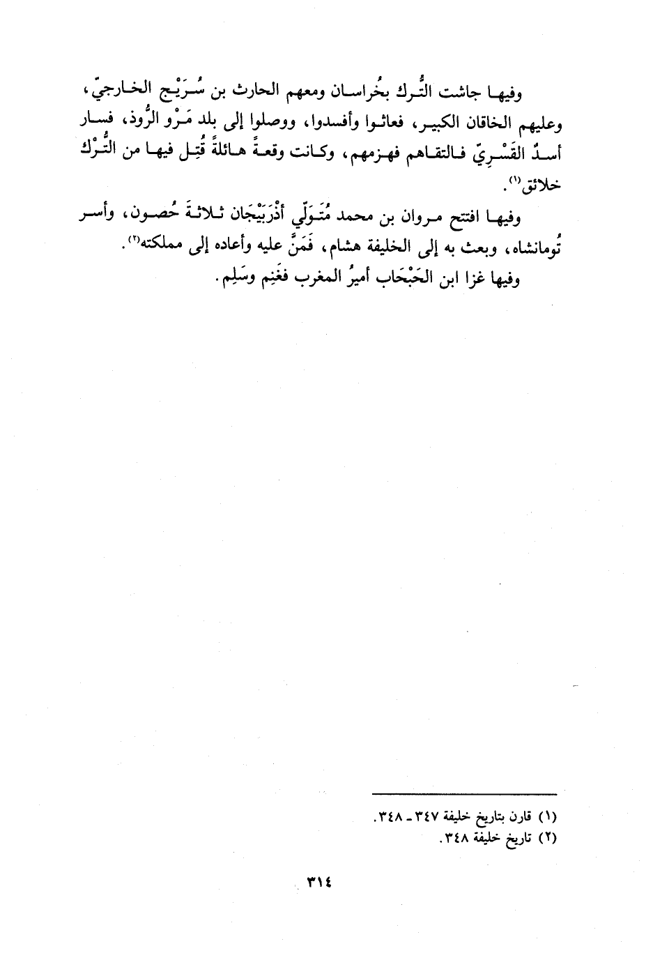 وَفِيهَا جَاشَتِ التُّرْكُ بِخُرَاسَانَ وَمَعَهُمُ الْحَارِثُ بْنُ سُرَيْجٍ الْخَارِجِيُّ، وَعَلَيْهِمُ الْخَاقَانُ الْكَبِيرُ، فَعَاثُوا وَأَفْسَدُوا، ووصلوا إلى بلد مروالرّوذ، فَسَارَ أَسَدٌ الْقَسْرِيُّ فَالْتَقَاهُمْ فَهَزَمَهُمْ، وَكَانَتْ وَقْعَةً هَائِلَةً قُتِلَ فِيهَا مِنَ التُّرْكِ خَلائِقُ [1] .