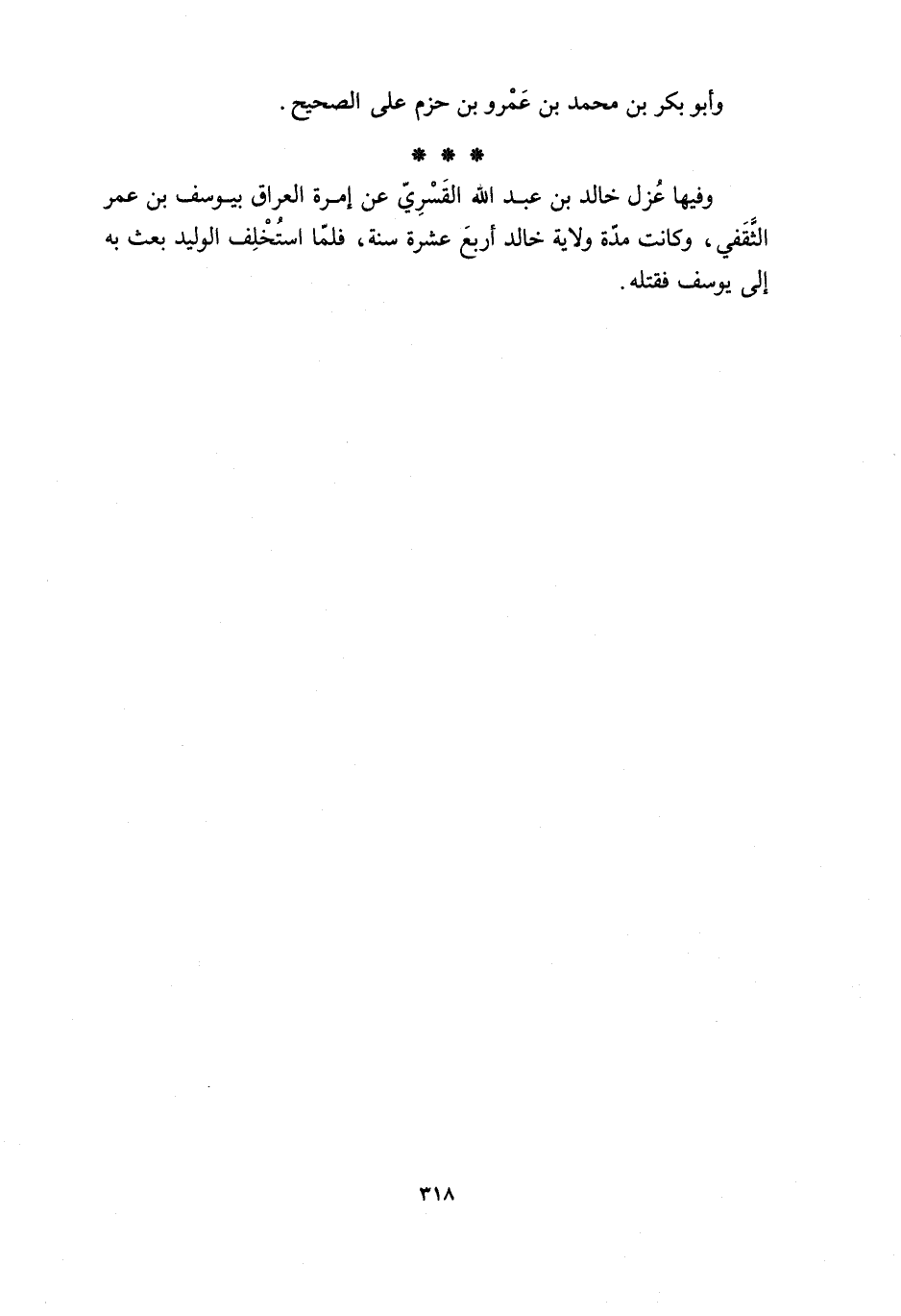 وَفِيهَا عُزِلَ خَالِدُ بْنُ عَبْدِ اللَّهِ الْقَسْرِيُّ عَنْ إِمْرَةِ الْعِرَاقِ بِيُوسُفَ بْنِ عُمَرَ الثَّقَفِيِّ، وَكَانَتْ مُدَّةُ وِلايَةِ خَالِدٍ أَرْبَعَ عَشْرَةَ سَنَةً، فَلَمَّا اسْتُخْلِفَ الْوَلِيدُ بَعَثَ بِهِ إِلَى يُوسُفَ فَقَتَلَهُ.