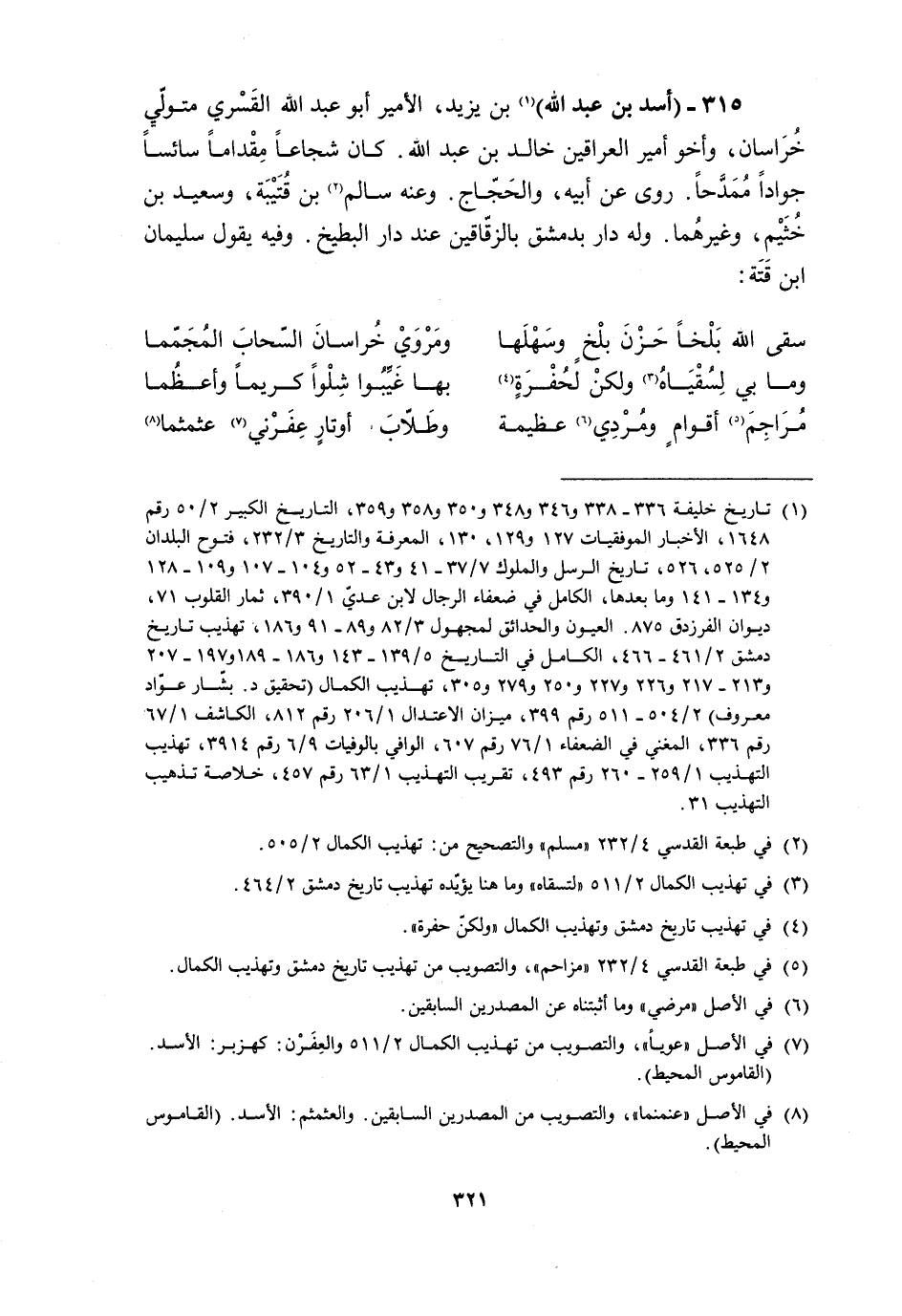 315- (أسد بن عبد الله) [1] بن يزيد، الأمير أبو عبد الله القسري متولي خراسان، وأخو أمير العراقين خالد بن عبد الله. كان شجاعا مقداما سائسا جوادا ممدحا. روى عَنْ أبيه، والحجّاج. وعنه سالم [2] بن قتيبة، وسعيد بن خثيم، وغيرهما. وله دار بِدِمَشْقَ بِالزَّقَّاقَيْنِ عِنْدَ دَارِ الْبِطِّيخِ. وَفِيهِ يَقُولُ سليمان ابن قَتَةَ: