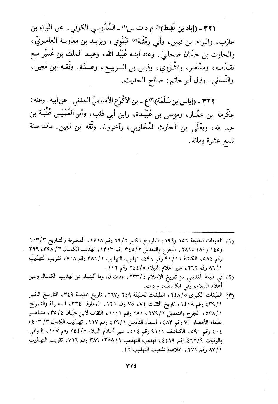 [1] الطبقات لخليفة 156 و 199، التاريخ الكبير 2/ 69 رقم 1718، المعرفة والتاريخ 3/ 103 و 145 و 180 و 281، الجرح والتعديل 2/ 345 رقم 1313، تهذيب الكمال 3/ 398، 399 رقم 584، الكاشف 1/ 90 رقم 499، تهذيب التهذيب 1/ 386 رقم 708، تقريب التهذيب 1/ 86 رقم 662، سير أعلام النبلاء 5/ 244 رقم 106.