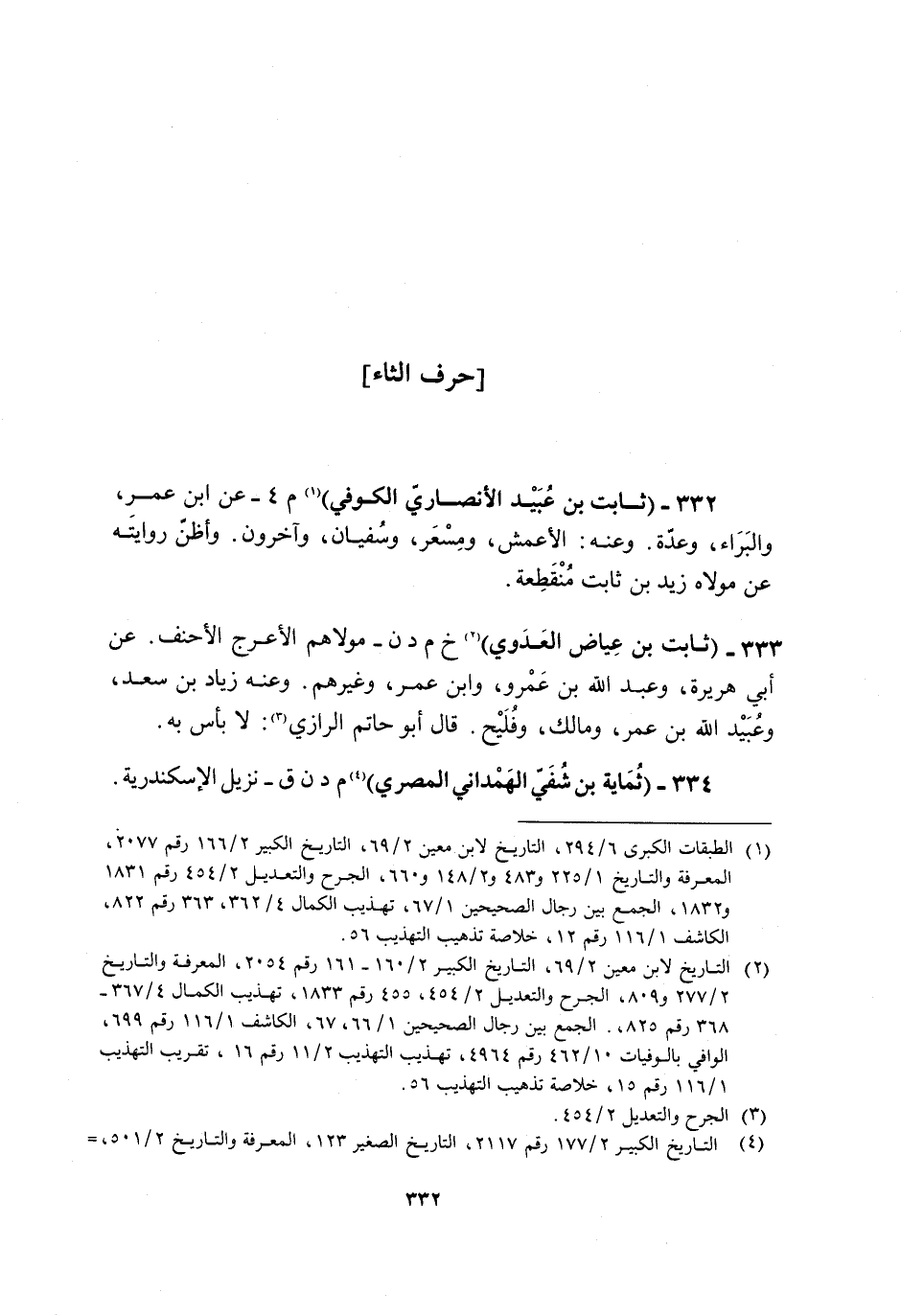332- (ثَابِتُ بْنُ عُبَيْدٍ الأَنْصَارِيُّ الْكُوفِيُّ) [1] م 4- عَنِ ابْنِ عُمَرَ، وَالْبَرَاءِ، وَعِدَّةٍ. وَعَنْهُ: الأَعْمَشُ، وَمِسْعَرٌ، وَسُفْيَانُ، وَآخَرُونَ. وَأَظُنُّ رِوَايَتَهُ عَنْ مَوْلاهُ زَيْدِ بْنِ ثَابِتٍ مُنْقَطِعَةٌ.
