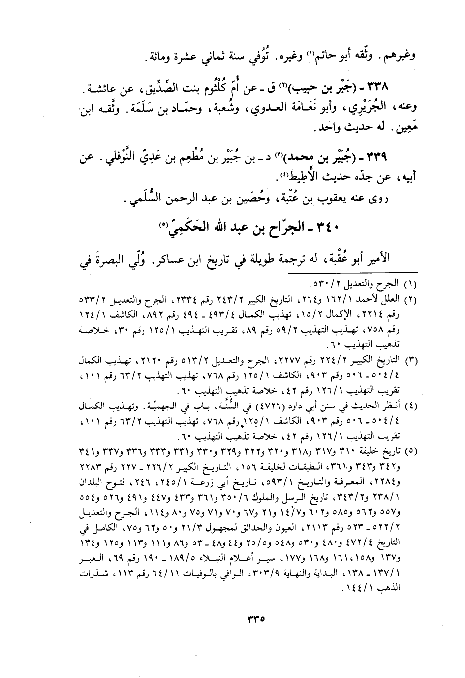 340- الجرّاح بن عبد الله بن الْحَكَمِيُّ [5] الأَمِيرُ أَبُو عُقْبَةَ، لَهُ تَرْجَمَةٌ طَوِيلَةٌ فِي تَارِيخِ ابْنِ عَسَاكِرٍ. وُلِّيَ الْبَصْرَةَ فِي