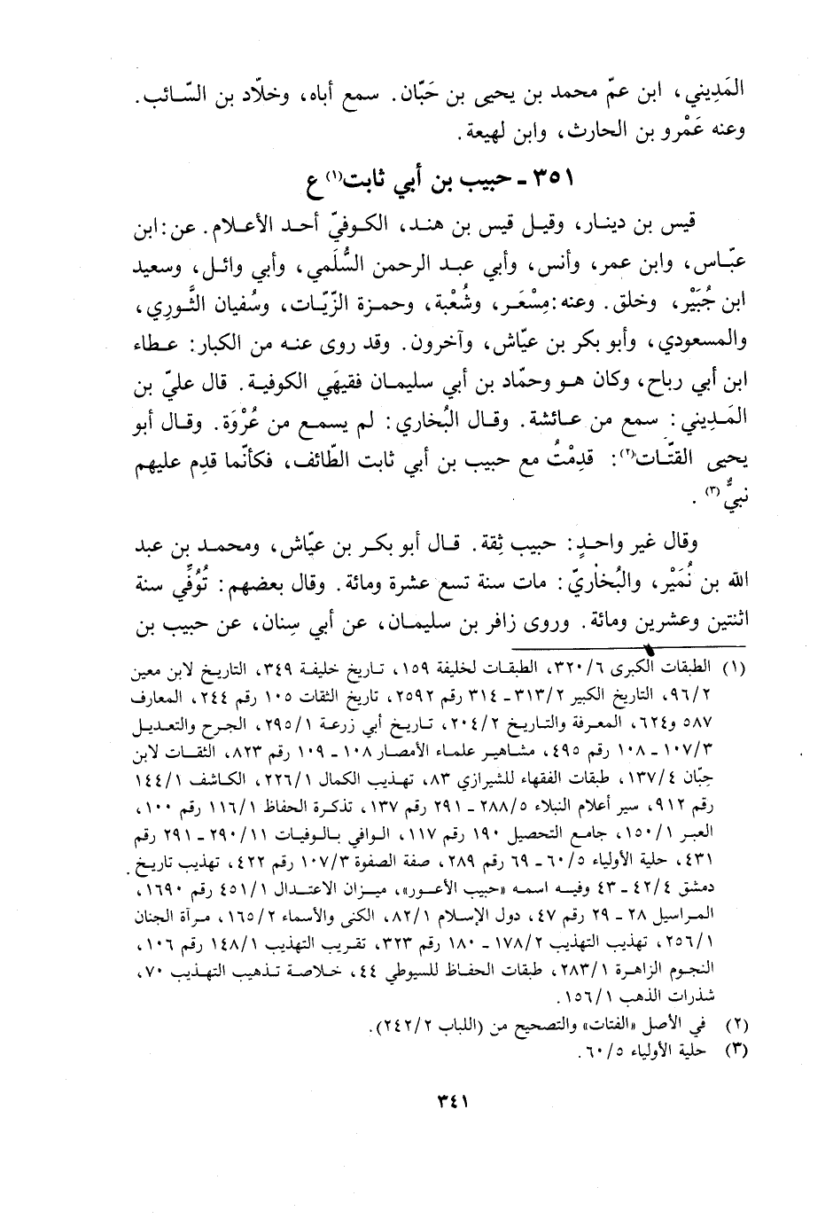 [1] الطبقات الكبرى 6/ 320، الطبقات لخليفة 159، تاريخ خليفة 349، التاريخ لابن معين 2/ 96، التاريخ الكبير 2/ 313- 314 رقم 2592، تاريخ الثقات 105 رقم 244، المعارف 587 و 624، المعرفة والتاريخ 2/ 204، تاريخ أبي زرعة 1/ 295، الجرح والتعديل 3/ 107- 108 رقم 495، مشاهير علماء الأمصار 108- 109 رقم 823، الثقات لابن حبّان 4/ 137، طبقات الفقهاء للشيرازي 83، تهذيب الكمال 1/ 226، الكاشف 1/ 144 رقم 912، سير أعلام النبلاء 5/ 288- 291 رقم 137، تذكرة الحفاظ 1/ 116 رقم 100، العبر 1/ 150، جامع التحصيل 190 رقم 117، الوافي بالوفيات 11/ 290- 291 رقم 431، حلية الأولياء 5/ 60- 69 رقم 289، صفة الصفوة 3/ 107 رقم 422، تهذيب تاريخ دمشق 4/ 42- 43 وفيه اسمه «حبيب الأعور» ، ميزان الاعتدال 1/ 451 رقم 1690، المراسيل 28- 29 رقم 47، دول الإسلام 1/ 82، الكنى والأسماء 2/ 165، مرآة الجنان 1/ 256، تهذيب التهذيب 2/ 178- 180 رقم 323، تقريب التهذيب 1/ 148 رقم 106، النجوم الزاهرة 1/ 283، طبقات الحفاظ للسيوطي 44، خلاصة تذهيب التهذيب 70، شذرات الذهب 1/ 156.