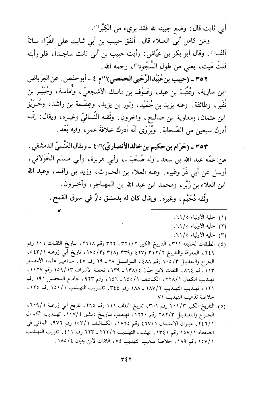 352- (حَبِيبُ بْنُ عُبَيْدٍ الرَّحَبِيُّ الحمصي) [4] م 4- أبو حفص. عن العرباض ابن سَارِيَةَ، وَعُتْبَةَ بْنِ عَبْدٍ، وَعَوْفِ بْنِ مَالِكٍ الأَشْجَعِيِّ، وَأُمَامَةَ، وَجُبَيْرِ بْنِ نُفَيْرٍ، وَطَائِفَةٍ. وَعَنْهُ يَزِيدُ بْنُ حُمَيْدٍ، وَثَوْرُ بْنُ يَزِيدَ، وَعِصْمَةُ بن راشد، وحريز ابن عُثْمَانَ، وَمُعَاوِيَةُ بْنُ صَالِحٍ، وَآخَرُونَ. وَثَّقَهُ النَّسَائِيُّ وَغَيْرُهُ، وَيُقَالُ: إِنَّهُ أَدْرَكَ سَبْعِينَ مِنَ الصَّحَابَةِ. وَيُرْوَى أَنَّهُ أَدْرَكَ خِلافَةَ عُمَرَ، وَفِيهِ بُعْدٌ.