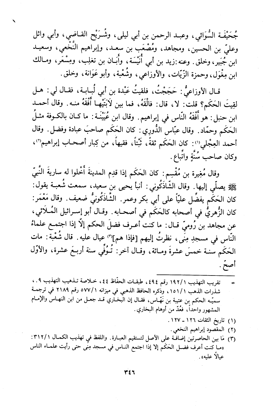 [ () ] تقريب التهذيب 1/ 192 رقم 494، طبقات الحفّاظ 44، خلاصة تذهيب التهذيب 9.، شذرات الذهب 1/ 151، وذكره الحافظ الذهبي في ميزانه 1/ 577 رقم 2189 في ترجمة سميّه الحكم بن عتيبة بن نهّاس، فقال إن البخاري قد جعل من ابن النهاس والإمام المشهور واحدا، فعدّ من أوهام البخاري.