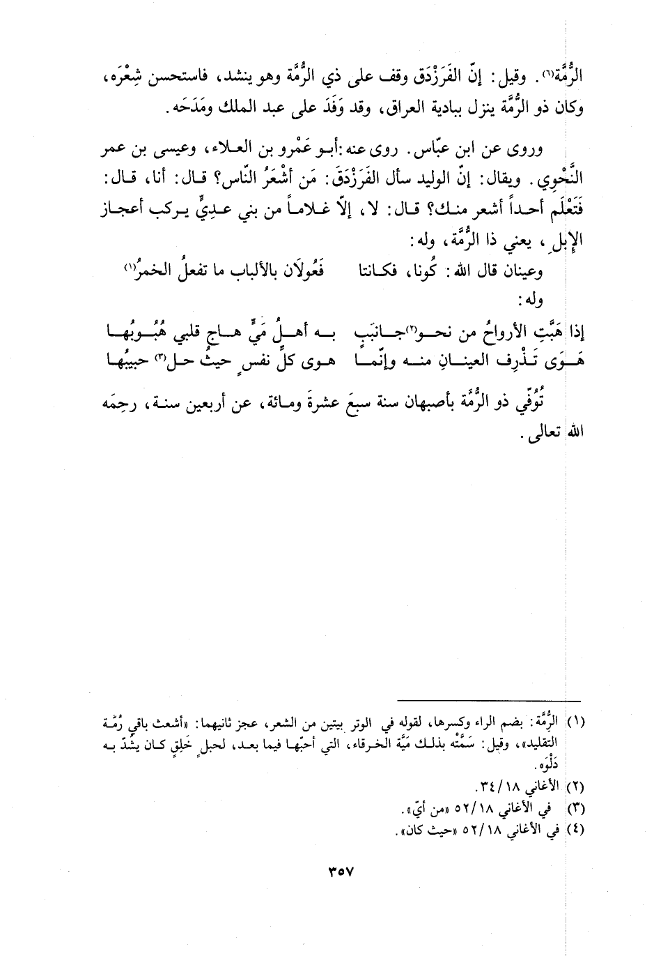 [1] الرّمّة: بضم الراء وكسرها، لقوله في الوتر بيتين من الشعر، عجز ثانيهما: «أشعث باقي رمّة التقليد» ، وقيل: سمّته بذلك ميّة الخرقاء، التي أحبّها فيما بعد، لحبل خلق كان يشدّ به دلوه.