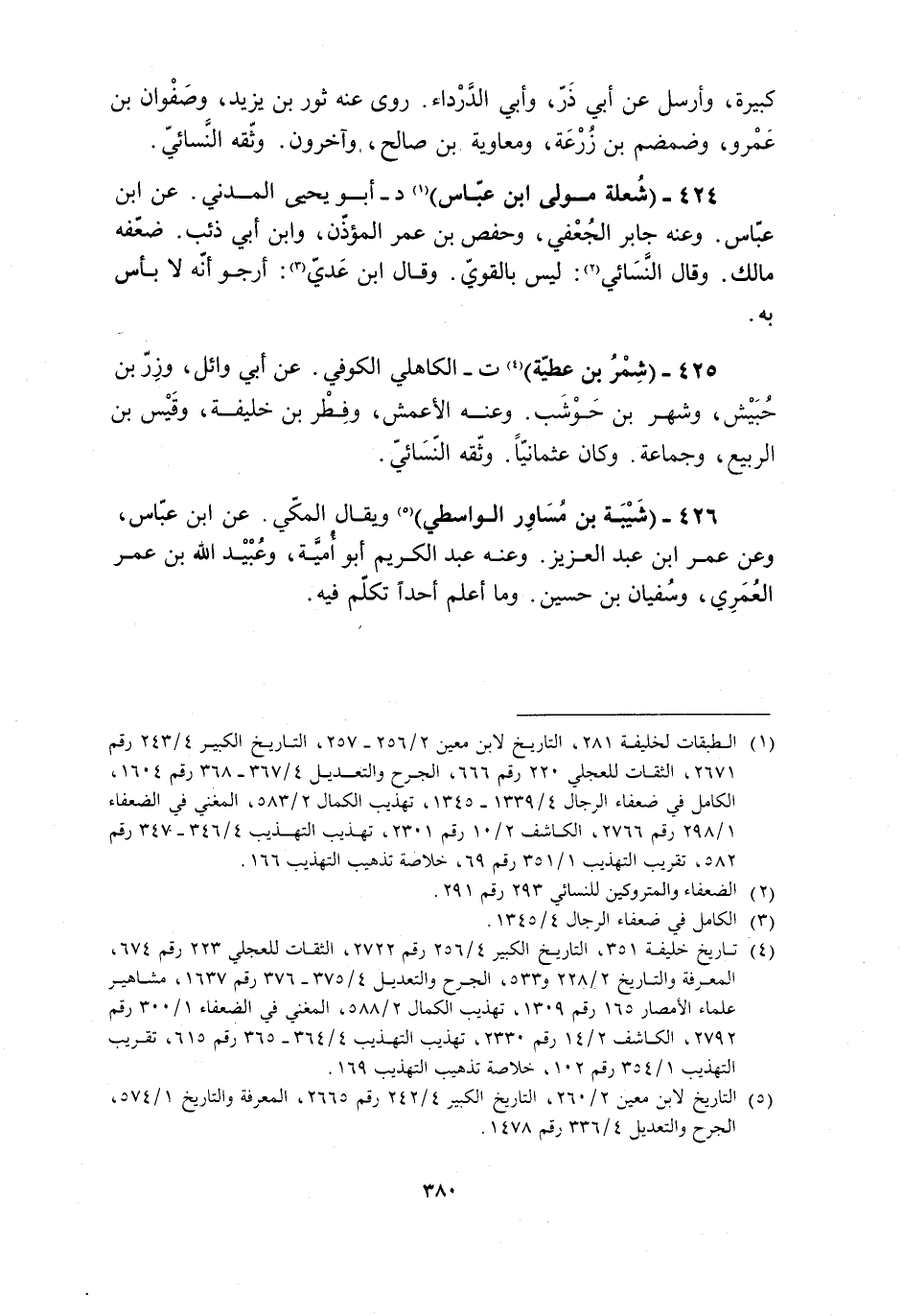 425- (شمر بن عطيّة) [4] ت- الكاهلي الكوفي. عَنْ أَبِي وائل، وزِر بْن حبيش، وشهر بْن حَوْشَب. وعَنْه الأعمش، وفِطْر بْن خليفة، وقَيْس بْن الربيع، وجماعة. وكان عثمانيًا. وثَّقه النّسائي.