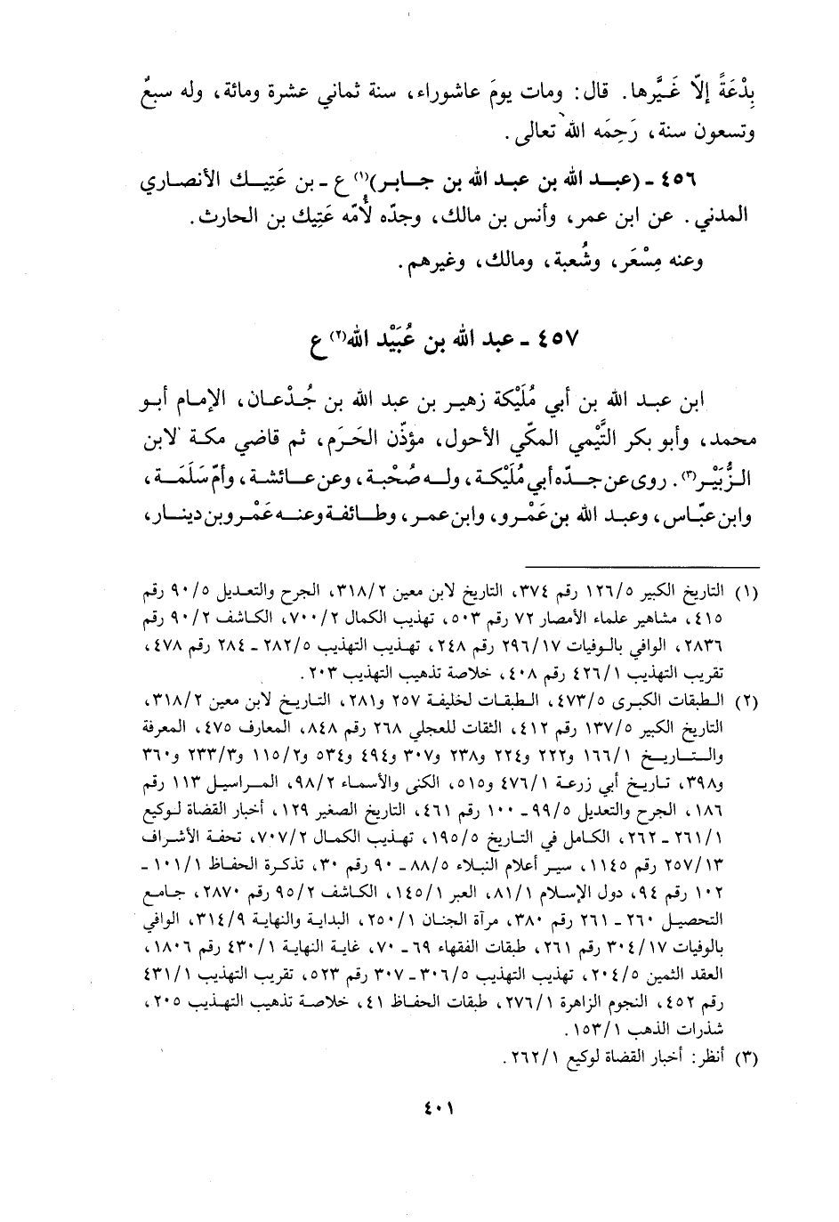 457- عَبْد اللَّه بْن عُبَيْد اللَّه [2] ع ابْن عَبْد اللَّه بْن أَبِي مُلَيْكة زهير بْن عَبْد اللَّه بْن جُدْعان، الإِمَام أَبُو محمد، وأبو بكر التّيمي المكّي الأحول، مؤذّن الحَرمَ، ثم قاضى مكة لابن الزُّبَيْر [3] . رَوَى عَنْ جدّه أَبِي مُلَيْكة، وله صُحْبة، وعَنْ عَائِشَةَ، وأم سَلَمَةَ، وابن عَبَّاس، وعبد الله بن عمرو، وابن عمر، وطائفة وعنه عمرو بن دينار،