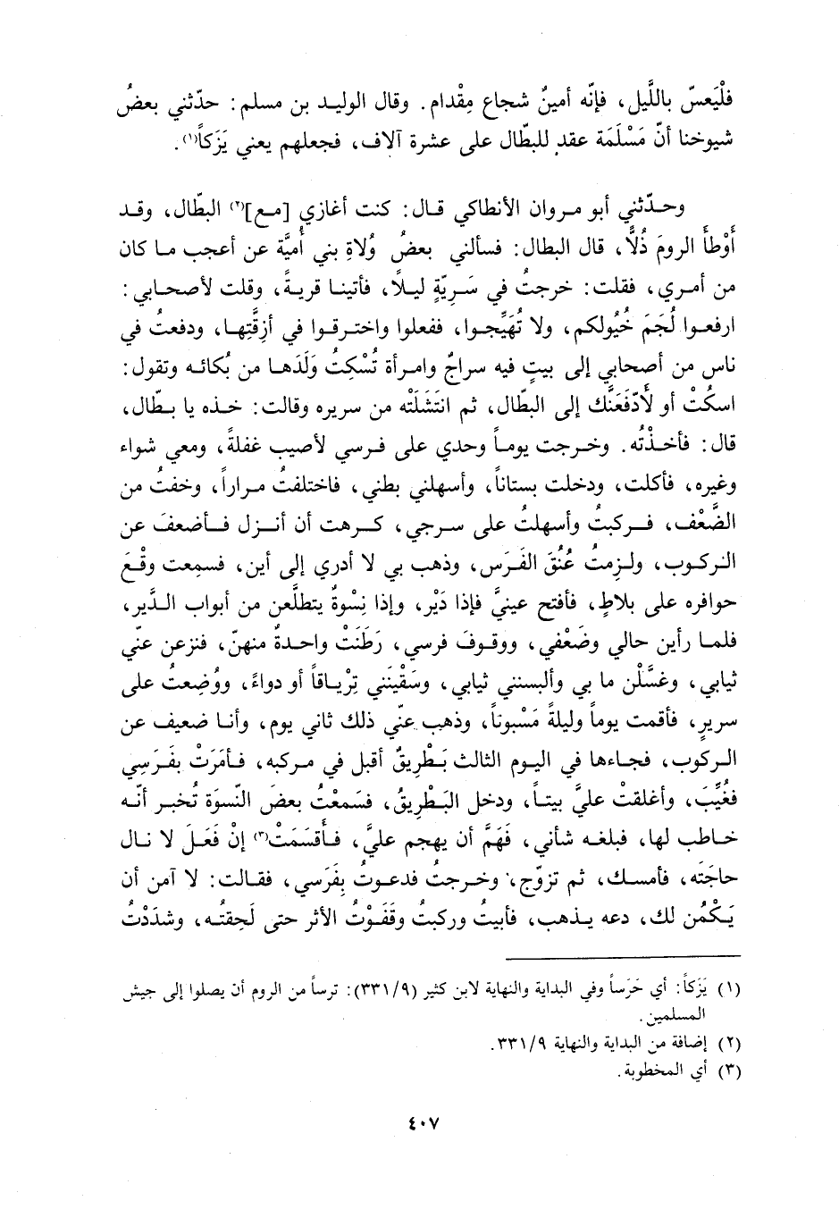 اسكُتْ أو لأَدّفَعَنَّك إلى البطّال، ثم انتَشَلَتْه مِنْ سريره وقالت: خذه يا بطّال، قَالَ: فأخذْتُه. وخرجت يومًا وحدي على فرسي لأصيب غفلةً، ومعي شواء وغيره، فأكلت، ودخلت بستانًا، وأسهلني بطني، فاختلفتُ مرارًا، وخفتُ مِنَ الضَّعف، فركبتُ وأسهلتُ عَلَى سرجي، كرهت أن أنزل فأضعفَ عَنِ الركوب، ولزِمتُ عُنُقَ الفَرَس، وذهب بي لا أدري إلى أَيْنَ، فسمِعت وَقْعَ حوافره عَلَى بلاطٍ، فأفتح عينيَّ فإذا دَيْر، وإذا نِسْوةٌ يتطلَّعن مِنْ أبواب الدَّير، فلما رأين حالي وضَعْفي، ووقوفَ فرسي، رَطَنَتْ واحدةٌ منهنّ، فنزعن عنّي ثيابي، وغسَّلْن ما بي وألبسنني ثيابي، وسَقْيَنني تِرْياقًا أو دواءً، ووُضعتُ على سرير، فأقمت يوما وليلة مسبوتا، وذهب عنّي ذَلِكَ ثاني يوم، وأنا ضعيف عَنِ الركوب، فجاءها فِي اليوم الثالث بَطْريقٌ أقبل فِي مركبه، فأمَرَتْ بفَرَسي فغُيِّبَ، وأغلقتْ عليَّ بيتًا، ودخل البَطْريقُ، فسَمعْتُ بعضَ النّسوَة تُخبر أنّه خاطب لها، فبلغه شأني، فَهَمَّ أن يهجم عَلَيَّ، فأَقسَمَتْ [3] إنْ فَعَلَ لا نال حاجَتَه، فأمسك، ثم تزوّج، وخرجتُ فدعوتُ بِفَرَسي، فقالت: لا آمن أن يَكْمُن لك، دعه يذهب، فأبيتُ وركبتُ وقَفَوْتُ الأثر حتى لحقته، وشددت