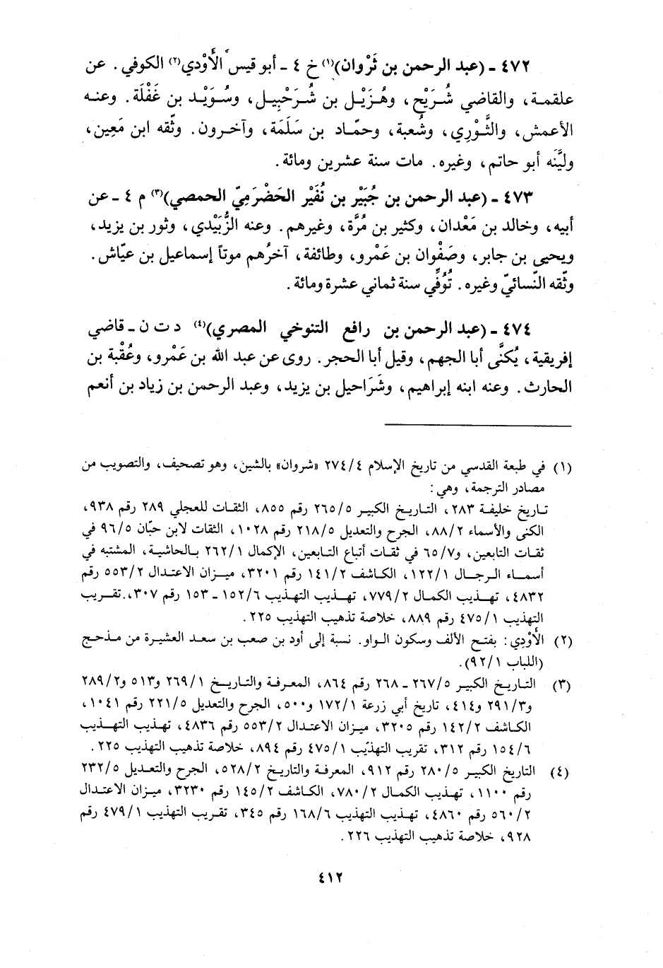 474- (عَبْد الرَّحْمَن بْن رافع التنوخي الْمَصْريّ) [4] د ت ن- قاضي إفريقية، يُكنَّى أَبَا الْجَهْمُ، وقيل أَبَا الحجر. رَوَى عَنْ عَبْدِ اللَّهِ بْنِ عَمْرٍو، وَعُقْبَةَ بن الحارث. وعنه ابنه إبراهيم، وشراحيل بن يزيد، وعبد الرحمن بن زياد بن أنعم
