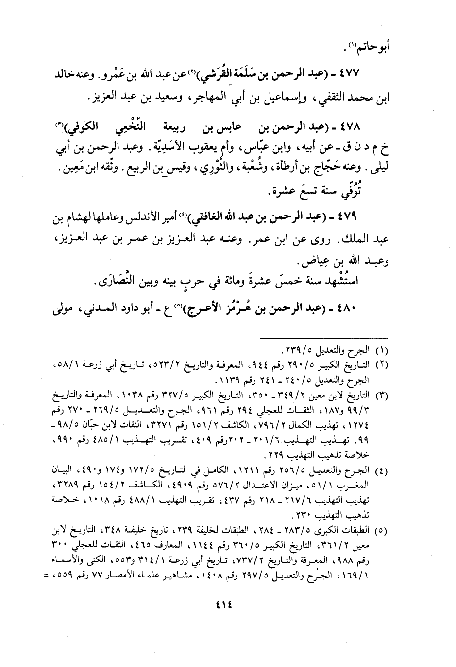 [2] التاريخ الكبير 5/ 290 رقم 944، المعرفة والتاريخ 2/ 523، تاريخ أبي زرعة 1/ 58، الجرح والتعديل 5/ 240- 241 رقم 1139.
