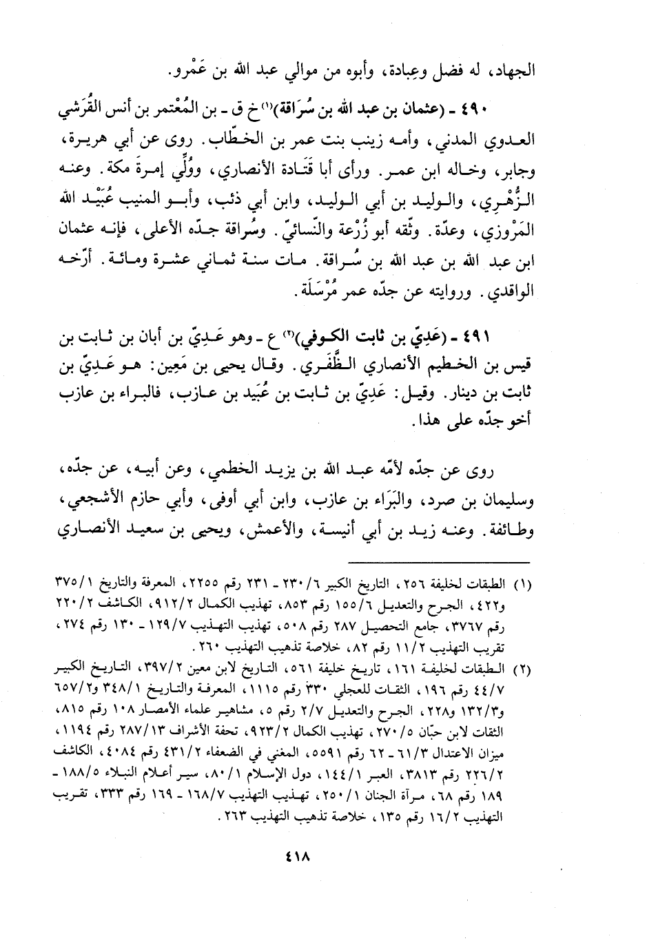 [1] الطبقات لخليفة 256، التاريخ الكبير 6/ 230- 231 رقم 2255، المعرفة والتاريخ 1/ 375 و 422، الجرح والتعديل 6/ 155 رقم 853، تهذيب الكمال 2/ 912، الكاشف 2/ 220 رقم 3767، جامع التحصيل 287 رقم 508، تهذيب التهذيب 7/ 129- 130 رقم 274، تقريب التهذيب 2/ 11 رقم 82، خلاصة تذهيب التهذيب 260.