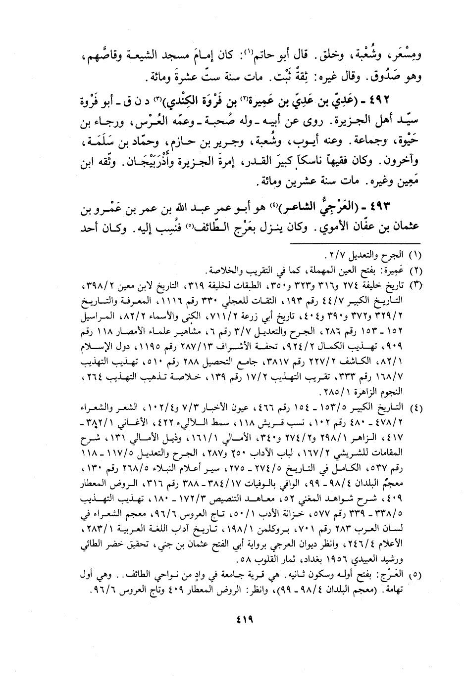 493- (العَرجّي الشاعر) [4] هُوَ أَبُو عُمَر عَبْد اللَّه بْن عُمَر بْن عَمْرو بْن عثمان بْن عفّان الأموي. وكان ينزل بعَرْج الطّائف [5] فنُسِب إِلَيْهِ. وكان أحد
