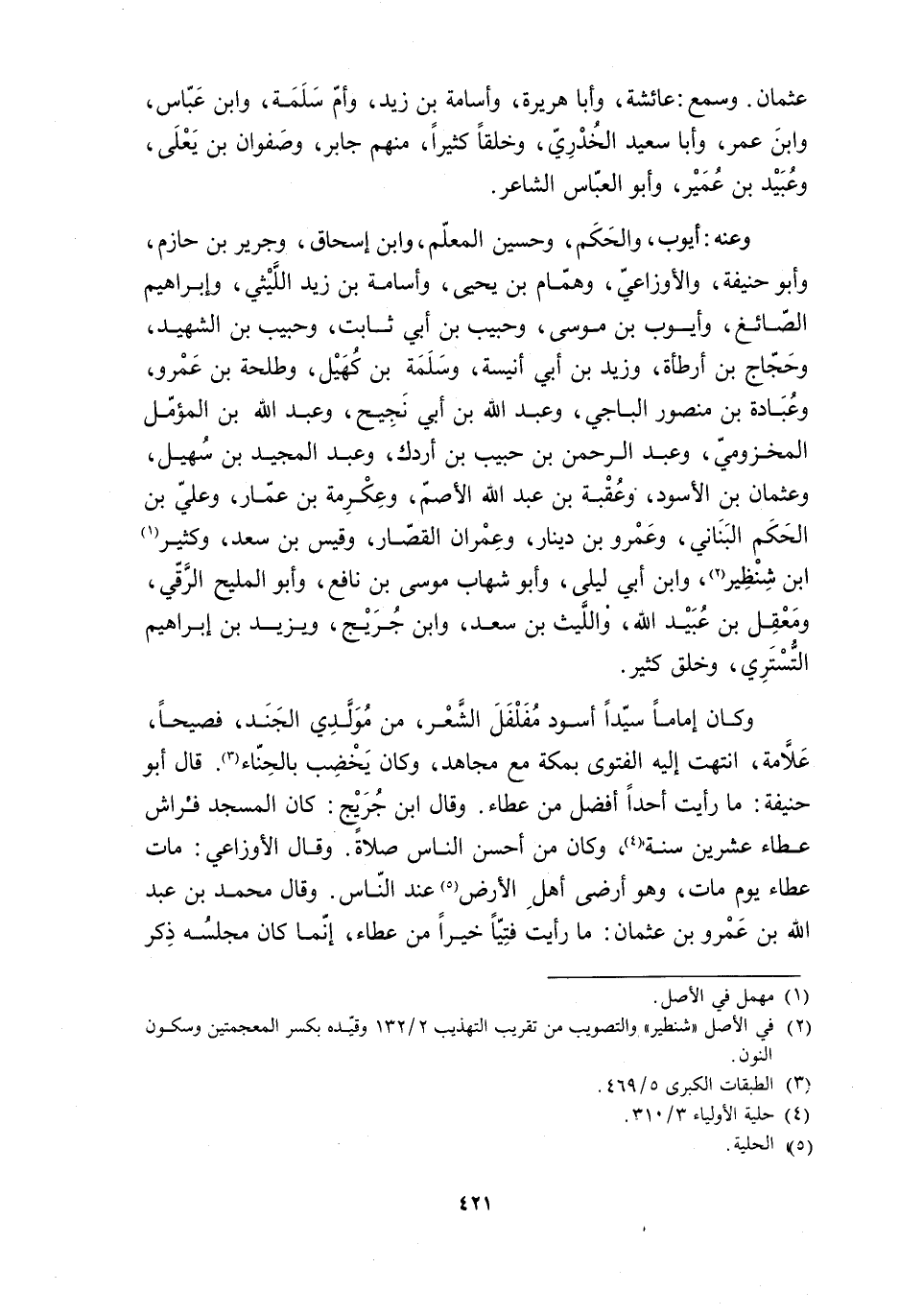 وكان إمامًا سيّدًا أسود مُفَلْفَلَ الشَّعْر، مِنْ مُوَلَّدِي الْجَنَد، فصيحًا، عَلامة، انتهت إِلَيْهِ الفتوى بمكة مَعَ مجاهد، وكان يَخْضِب بالحِنّاء [3] . قَالَ أَبُو حنيفة: ما رأيت أحدًا أفضل مِنْ عطاء. وقَالَ ابن جُرَيْج: كَانَ المسجد فراش عطاء عشرين سنة [4] ، وكان مِنَ أحَسَن النَّاسَ صلاةً. وقَالَ الأَوزاعيّ: مات عطاء يوم مات، وهو أرضى أهلِ الأرض [5] عند النَّاسَ. وقَالَ مُحَمَّد بْن عَبْد اللَّهِ بْن عَمْرو بْن عثمان: ما رأيت فتِيًّا خيرًا مِنْ عطاء، إنّما كَانَ مجلسه ذكر