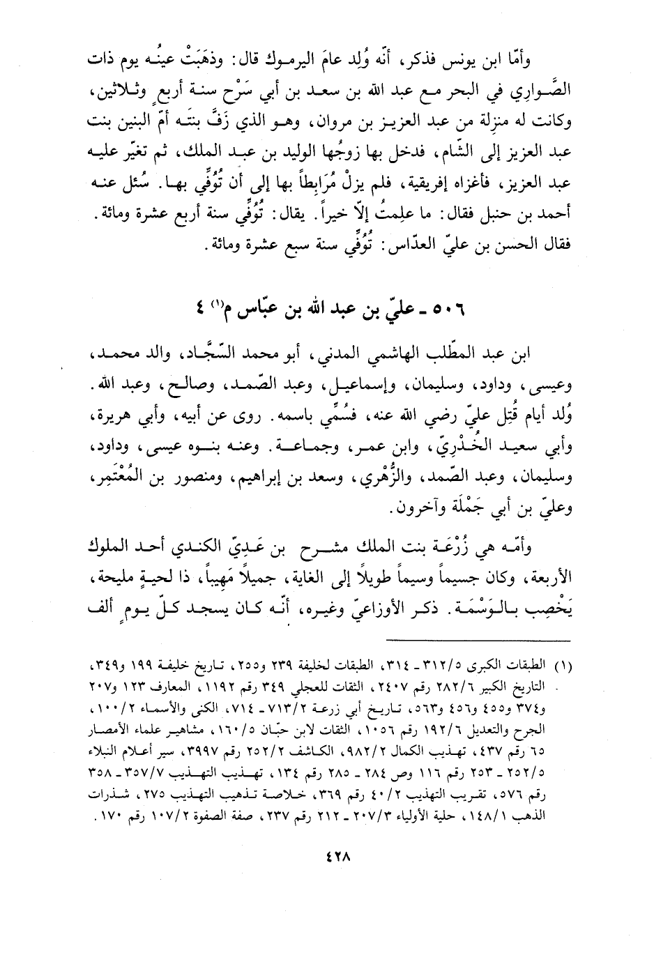 506- عَليّ بْن عَبْد الله بن عبّاس م [1] 4 ابن عَبْد المطّلب الهاشمي الْمَدَنِيّ، أَبُو مُحَمَّد السّجَّاد، والد مُحَمَّد، وعيسى، ودَاوُد، وسُلَيْمَان، وإِسْمَاعِيل، وعَبْد الصّمد، وصالح، وعَبْد اللَّه.