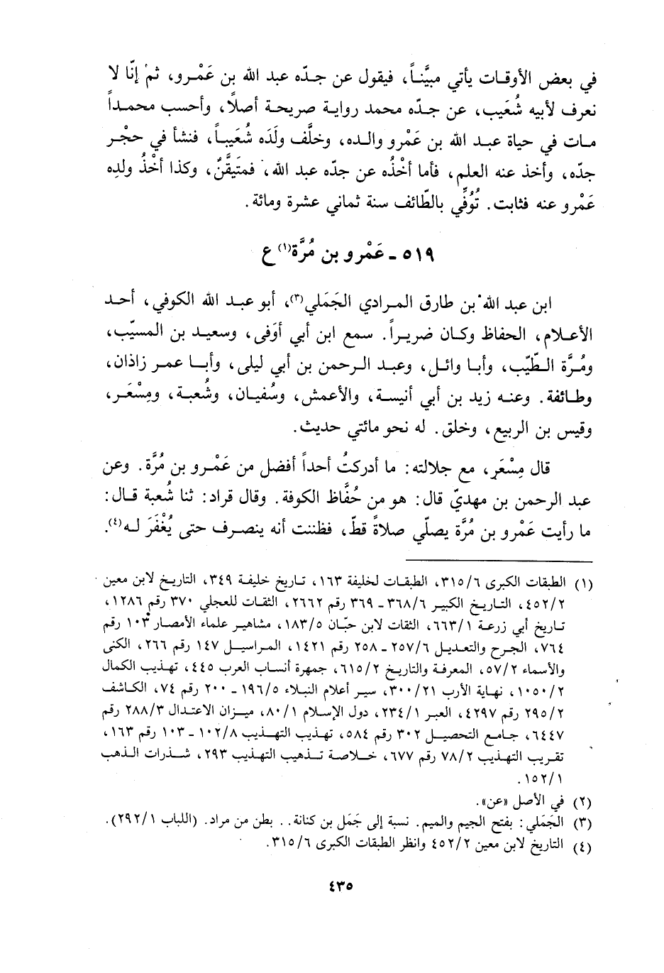 519- عمرو بن مرّة [1] ع [2] ابن عَبْد اللَّه بْن طارق المرادي الْجَمَلي [3] ، أبو عبد الله الكوفي، أحد الأعلام، الحفاظ وكان ضريرًا. سَمِعَ ابن أَبِي أوَفى، وسَعِيد بْن المسيّب، ومُرَّة الطّيّب، وأَبَا وائل، وعَبْد الرَّحْمَن بْن أبي ليلى، وأَبَا عُمَر زاذان، وطائفة. وعَنْه زيد بْن أَبِي أُنَيْسَةَ، والأعمش، وسُفْيان، وشُعْبَة، ومِسْعَر، وقيس بْن الربيع، وخلق. لَهُ نحو مائتي حديث.