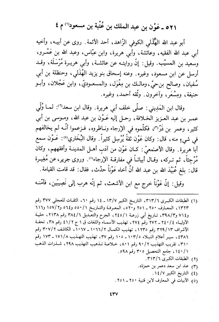 521- عَوْن بْن عَبْد الملك بْن عُتْبَة بْن مسعود [1] م 4 أبو عبد الله الهذلي الكوفي الزّاهد، أحد الأئمة. رَوى عَنْ أَبِيهِ، وأخيه أَبِي عَبْد اللَّه الفقيه، وعَائِشَة، وأَبِي هُرَيْرَةَ، وابن عَبَّاس، وعَبْد اللَّه بْن عَمْرو، وسَعِيد بْن المسيّب. وقيل: إنّ روايته عَنْ عَائِشَةَ، وأَبِي هُرَيْرَةَ مُرْسَلَة، وقد أرسل عَنِ ابن مسعود، وغيره. وعَنْه إسحاق بنو يزيد الْهُذَلِيُّ، وحنظلة بْن أَبِي سُفْيان، وصالح بْن حيّ، ومالك بْن مِغْوَلٍ، والمسعوديّ، وابن عَجْلان، وأَبُو حنيفة، ومِسْعَر، وآخرون. وثَّقه أَحْمَد، وغيره.