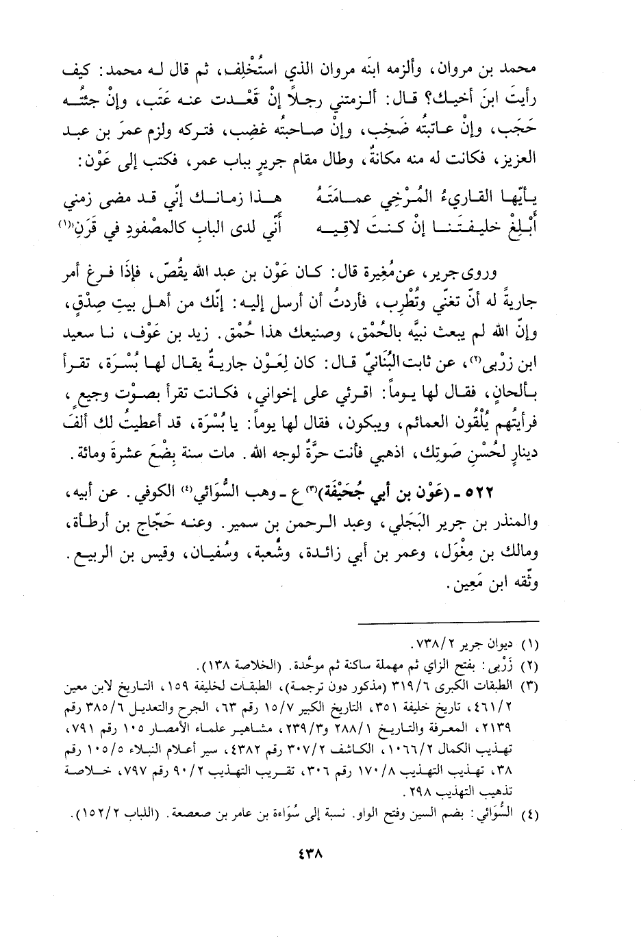 522- (عَوْن بْن أَبِي جحيفة) [3] ع- وهب السّوائي [4] الكوفي. عَنْ أَبِيهِ، والمنذر بْن جرير البَجَلي، وعَبْد الرَّحْمَن بْن سمير. وعَنْه حَجَّاج بْن أرطأة، ومالك بْن مِغْوَلٍ، وعُمَر بْن أَبِي زائدة، وشعبة، وسفيان، وقيس بن الربيع.