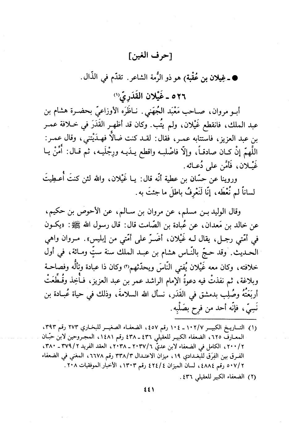 526- غيلان القدري [1] أبو مروان، صاحب مَعْبَد الْجُهَني. ناظَرَه الأَوزاعيّ بحضرة هشام بْن عَبْد الملك، فانقطع غَيْلان، ولم يتُب. وكان قد أظهر الْقَدَرَ فِي خلافة عُمَر بْن عَبْد العزيز، فاستتابه عُمَر، فقال: لقد كنت ضالا فهدَيْتني، وقَالَ عُمَر: