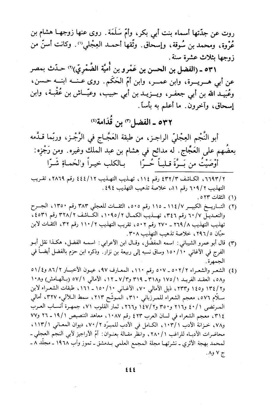 532- الفضل [3] بْن قُدَامة [4] أَبُو النَّجْم الْعِجْلِيُّ الراجز، مِنْ طبقة العَجَّاج فِي الرَّجْز، وربّما قدَّمه بعضُهم عَلَى العَجَّاج. لَهُ مدائح فِي هشام بن عبد الملك وغيره. ومن رَجْزِه: