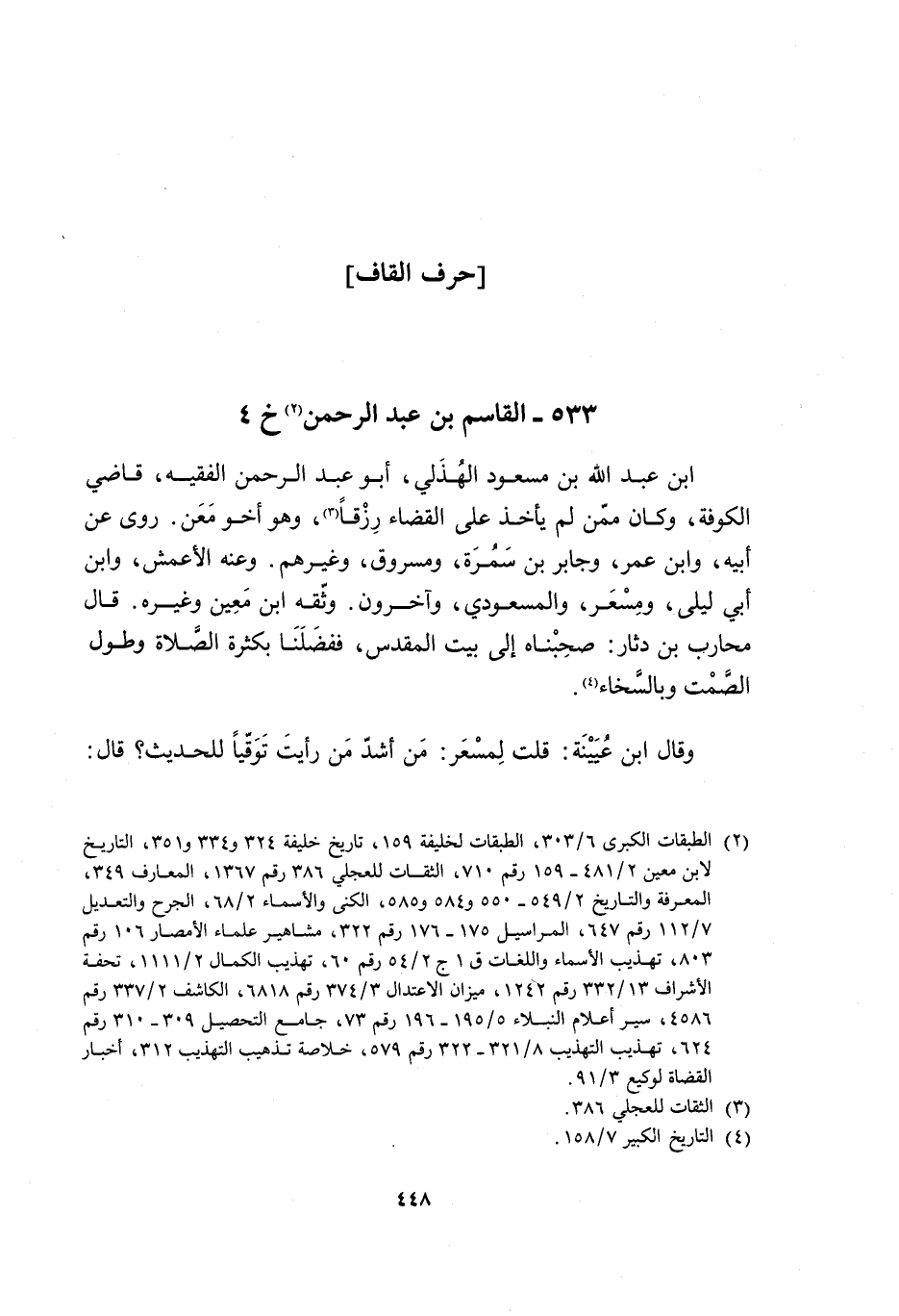 533- القاسم بن عبد الرحمن [2] خ 4 ابن عَبْد اللَّه بْن مسعود الْهُذَلَيُّ، أَبُو عبد الرحمن الفقيه، قاضي الكوفة، وكان ممّن لم يأخذ عَلَى القضاء رِزْقًا [3] ، وهو أخو مَعَن. رَوى عَنْ أبيه، وابن عمر، وجابر بن سمرة، ومسروق، وغيرهم. وعنه الأعمش، وابن أبي ليلى، ومسعر، والمسعودي، وآخرون. وثّقه ابن معين وغيره. قال محارب بن دثار: صحبناه إلى بيت المقدس، ففضلنا بكثرة الصلاة وطول الصمت وبالسخاء [4] .