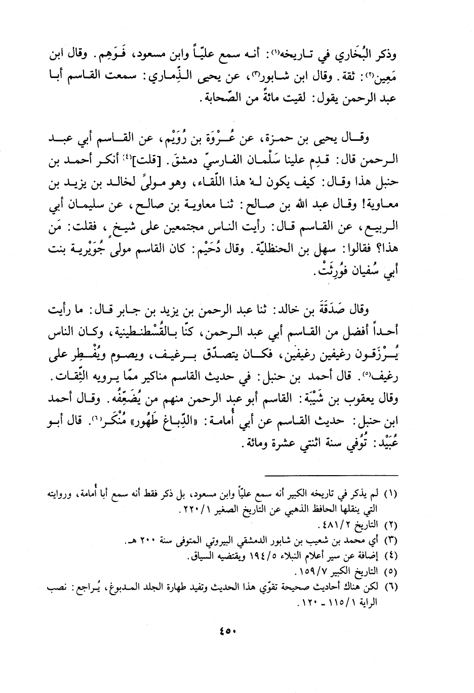 وقَالَ يعقوب بْن شَيْبَة: القاسم أَبُو عَبْد الرَّحْمَن منهم مِنْ يُضَعِفُه. وقَالَ أَحْمَد ابن حنبل: حديث القاسم عَنْ أَبِي أُمَامة: «الدِّباغ طَهُور» مُنْكر [6] . قَالَ أَبُو عُبَيْد: تُوُفِّي سنة اثنتي عشرة ومائة.