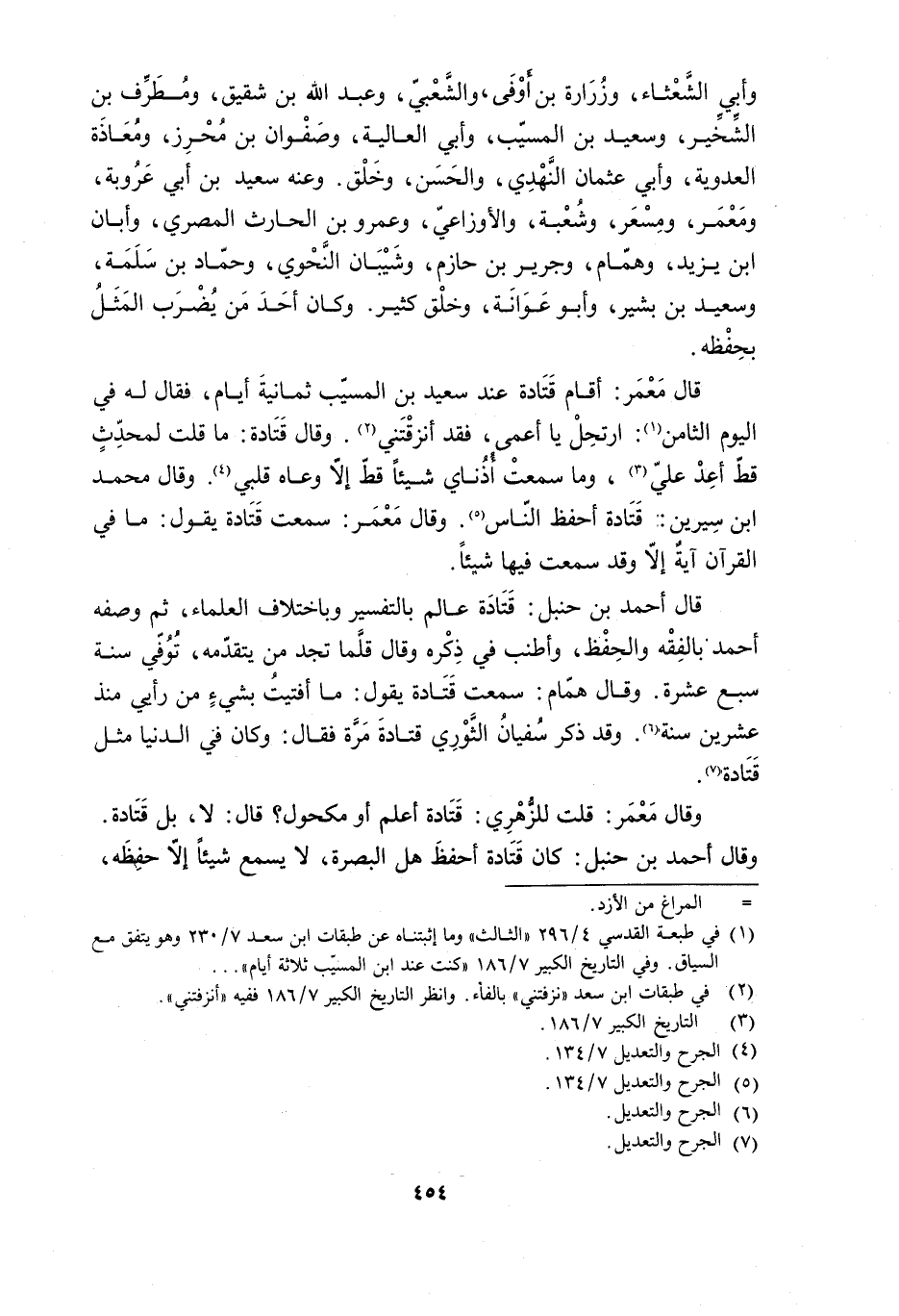 قَالَ أَحْمَد بْن حنبل: قَتَادةُ عالم بالتفسير وباختلاف العلماء، ثم وصفه أَحْمَد بالفِقْه والحِفْظ، وأطنب فِي ذِكْره وقَالَ قلَّما تجد مِنْ يتقدّمه، تُوُفِّي سنة سبع عشرة. وقَالَ همّام: سَمِعْتُ قَتَادةُ يَقُولُ: ما أفتيتُ بشيءٍ مِنْ رأيي منذ عشرين سنة [6] . وقد ذكر سُفْيان الثَّورِي قَتَادةُ مَرَّة فَقَالَ: وكان فِي الدنيا مثل قَتَادةُ [7] .